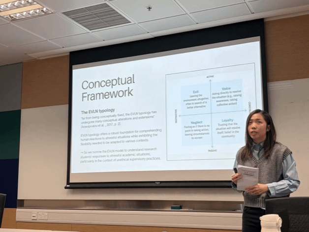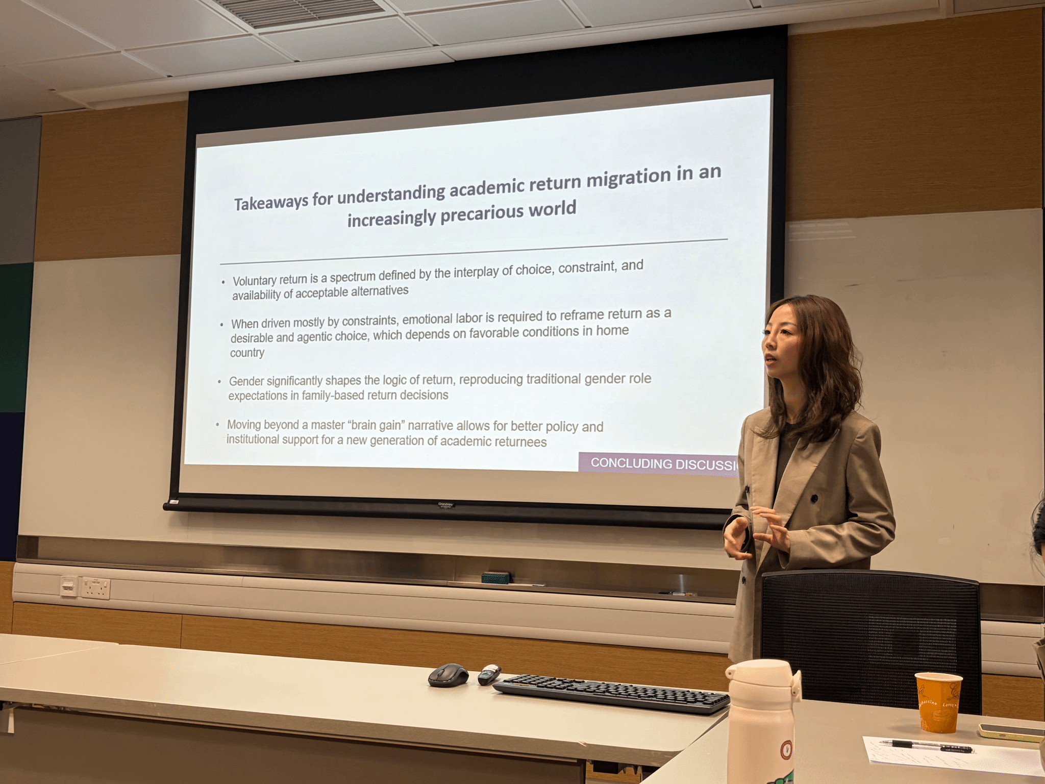 In the academic presentation session, Dr Michelle W. T. Cheng, assistant professor at The Education University of Hong Kong, delivered a presentation entitled “Examining students’ behavioral responses to unethical academic supervision” The study conceptualized unethical supervisory practices as a multidimensional phenomenon and adopted the EVLN (Exit–Voice–Loyalty–Neglect) framework to analyze doctoral students’ responses along the axes of active versus passive and constructive versus destructive behaviors. Drawing on a comparative analysis of doctoral supervision experiences in Hong Kong and Shanghai, the presentation offered important insights into supervisory power dynamics across different institutional contexts and provided valuable theoretical and empirical implications for improving supervisory governance in universities. This was followed by a presentation by Dr Sun Xiujuan, assistant professor at the Institute of Education, Xiamen University, entitled “Unpacking the driving forces and dynamics of return migration among Chinese early-career STEM researchers.” The presentation highlighted that, against the backdrop of a “North-to-South” shift in global talent flows, external forces such as geopolitical tensions, changes in immigration policies in developed economies, and the impacts of the COVID-19 pandemic are interacting with domestic pull factors, including improvements in China’s research infrastructure, talent policies, and the distinctive family dynamics of the one-child generation in reshaping the mobility patterns of Chinese overseas scientific talents. The study underscored that academic return migration should not be understood simply in terms of “brain drain” or “brain gain,” but rather as a continuum shaped by the interplay between transnational structural conditions and diverse individual aspirations, offering a fresh theoretical lens for understanding the complexity of academic mobility in the contemporary era.