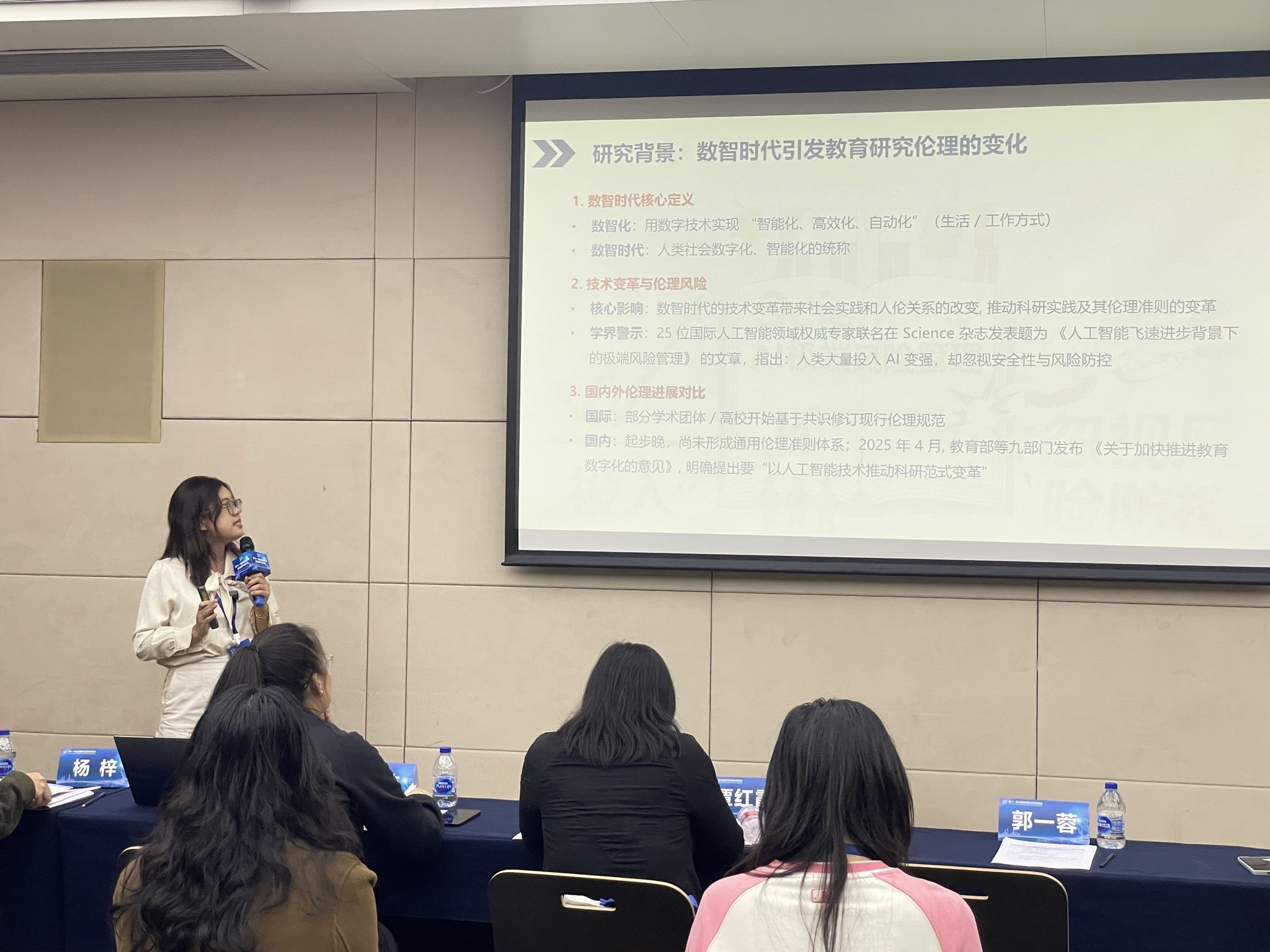 You Hongmiao, a master’s student at East China Normal University, delivered a report titled “Responding to Ethical Challenges and Crafting Norms for Educational Research in the Data-Intelligence Era.” Taking an institutional perspective on research ethics, she dissected the data-security and privacy-protection risks that arise when AI is woven into educational inquiry, underscoring the urgent need to build a comprehensive ethical-regulatory system. Her analysis furnishes critical reflections for steering the normative development and ethical governance of education research in the age of data and intelligence.