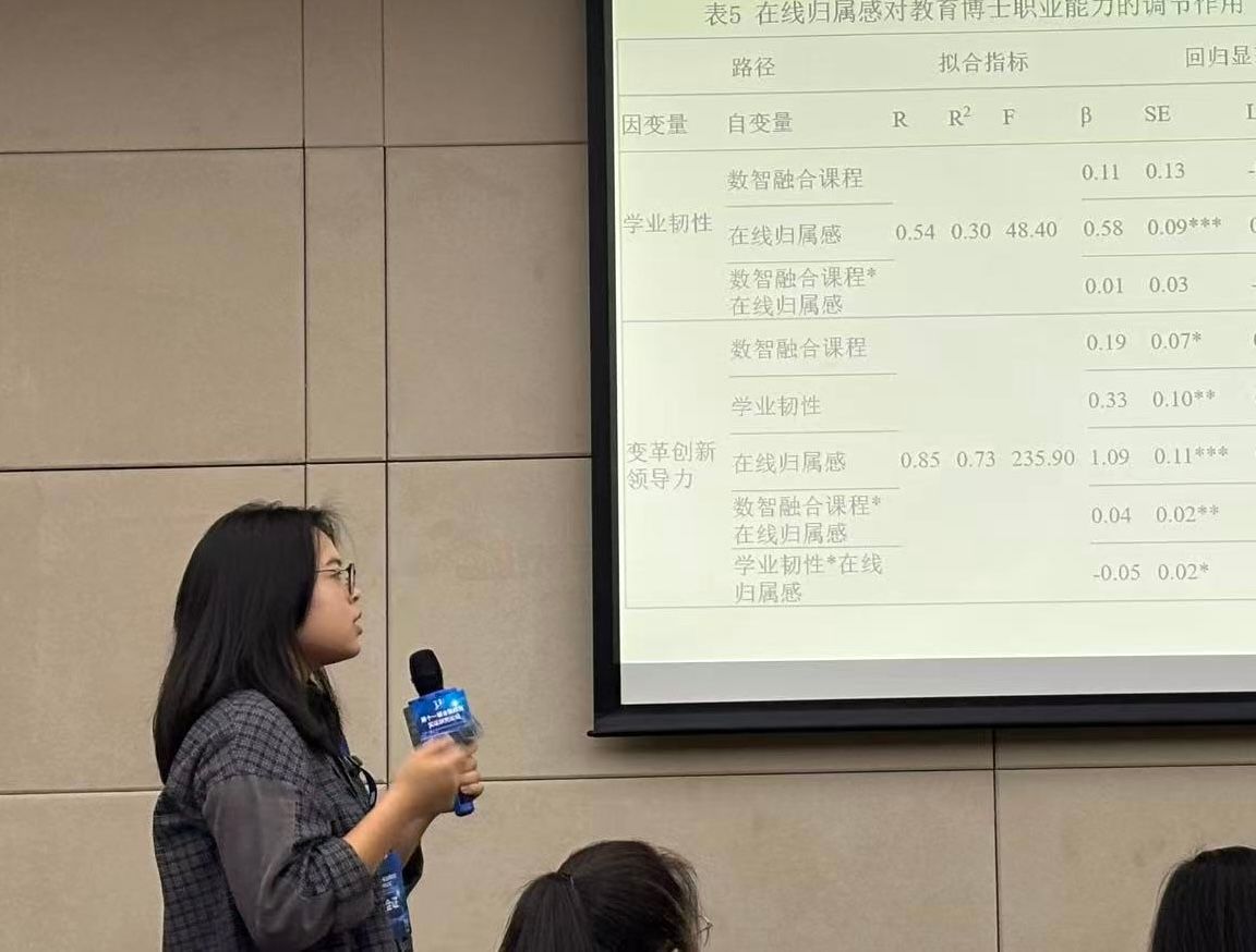 Chen Wenxin, a doctoral student at Xiamen University’s Institute of Education, delivered a report titled “The Formation Logic and Enhancement Strategies of Professional Competencies for Ed.D. Students in the Data-Intelligence Era.” Through an in-depth analysis of Ed.D. training data, she systematically outlined the distinctive features of doctoral education in this era, scientifically mapped the taxonomy of professional competencies required of education doctorates, and revealed how individual agency and collective synergy jointly shape competency development. Her findings offer both theoretical grounding and practical guidance for innovating Ed.D. programs in the age of data and intelligence.