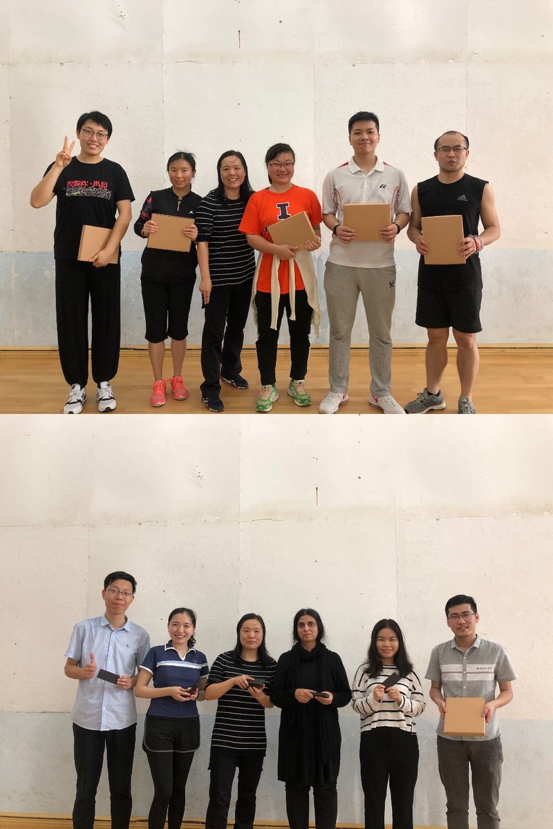 热身过后,队员们按照分组依次进行比赛。参赛选手们使出浑身解数,你追我赶,赛得畅快淋漓,,拉拉队们热情助威,整个赛场充满了加油声和喝彩声。在男单第一场的比赛中,陈斌老师和杨东同学厮杀激烈,比分不相上下。女双比赛更是赛点满满,A组选手蔡秀英老师、谢娟同学和B组选手刘梦今老师、黄路遥同学一直打到第五局才分出胜负。其他各位参赛者们也纷纷拿出各自的“看家本领”,全力出击。经过多场激烈的角逐,A队以6场5胜的优势赢得比赛,最后覃红霞老师为此次参与比赛的队员颁发奖品。