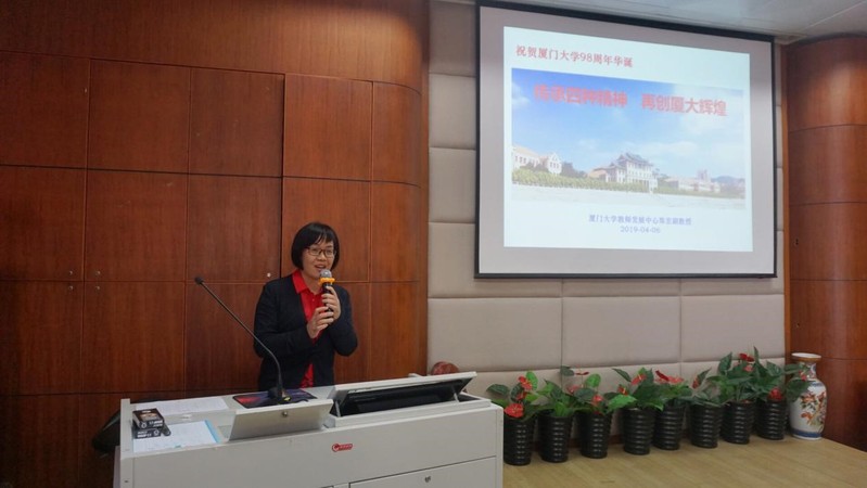 上午10点30分,会议在全体成员的校歌声中拉开帷幕。按照大会的传统,第一个环节为校史介绍,由郑宏副教授主讲。郑宏副教授提出,我们作为厦大人,在年年过校庆时不仅要有幸福感,还应当具备继往开来、发扬传统的使命感。她从陈嘉庚先生的爱国精神、罗扬才烈士的革命精神、以萨本栋为代表的艰苦办学的自强精神、王亚南和陈景润的科学精神等方面、通过陈嘉庚毁家兴学、革命烈士囊萤之光、萨本栋舍身治校、王亚南严谨治学、陈景润潜心科研等故事,将那一段段艰难却光辉的岁月为我们娓娓道来,并鼓励我们积极传承这四种精神,再创厦大辉煌。