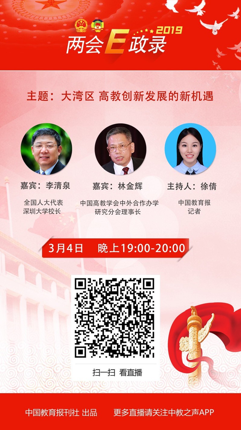 全国两会期间,3月4日晚上7点至8点,我校中外合作办学研究中心(教育部中外合作办学理论研究基地、政策咨询平台和中心)主任、中国高等教育学会中外合作办学研究分会理事长、教育研究院教授林金辉作为特邀嘉宾,在北京的演播厅接受“两会E政录”专题访谈直播,畅谈中外合作办学和粤港澳大湾区高等教育融合创新等问题。