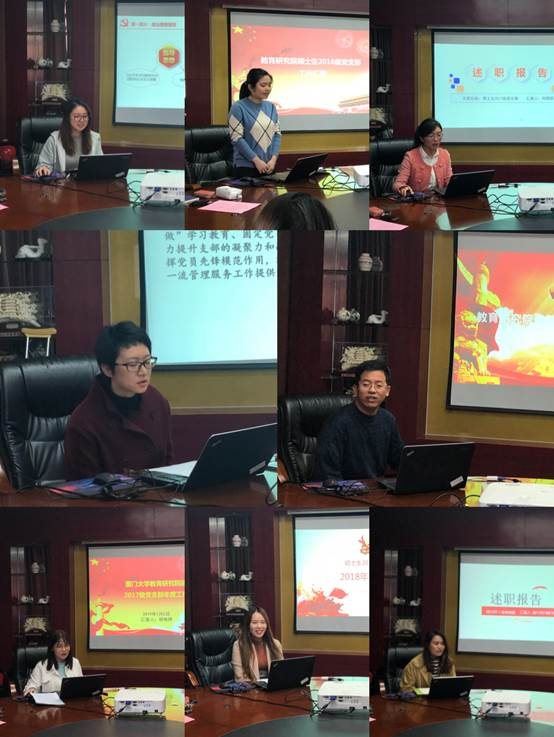 接着,各党支部书记依次从2018年度履行党建责任情况、党建进展和成效、思想政治工作情况、突出问题及思路措施等方面进行了述职报告,报告内容详实,工作总结到位。各支部学习重点突出,学习方式多样,其中实践学习、集体观影、读书分享、党的知识竞赛成为党员较为喜欢的学习方式而被诸多支部所采用。各支部通过积极开展线上及线下丰富多彩的党建学习活动,进一步坚定了支部党员的政治理想信念,彰显了支部党员的先锋模范作用。