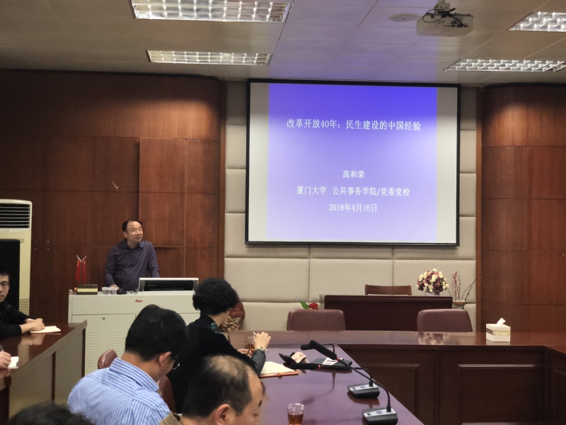 2018年4月16日下午固定党日,应我院党委邀请,厦门大学党委党校常务副校长高和荣为学院师生作了一场题为《改革开放40年:民生建设的中国经验》的专题报告。期间,高和荣教授言语幽默又不失严谨,内容详实又不失精炼,案例剖析和观点论证更是恰到好处,充分展现出一位对中国民生建设研究卓有建树的专家学者的睿智,带领在座师生全面且深入地学习了我国改革开放40年来在民生建设方面所取得的成就、存在的问题以及积累而成的独特经验。本次报告由院党委书记郑冰冰主持,全体教工和全体学生党员参与了学习。