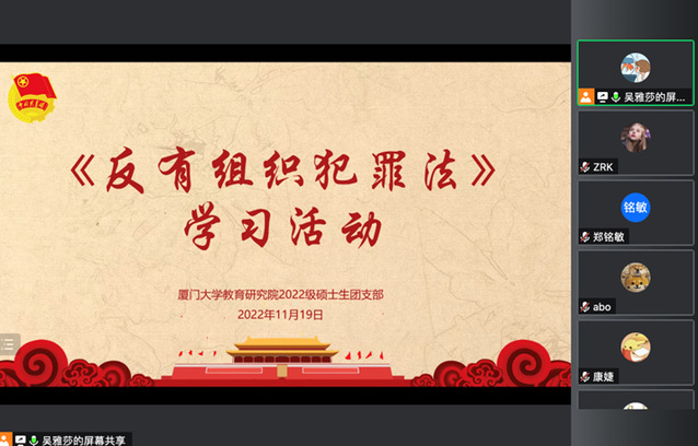 为有效推动反有组织犯罪法的宣传,推进扫黑除恶专项斗争常态化开展,不断增强青年团员自我保护意识和同黑恶势力斗争的积极性、主动性,2022年11月21日至11月25日,教育研究院组织各团支部开展了《反有组织犯罪法》的学习活动。