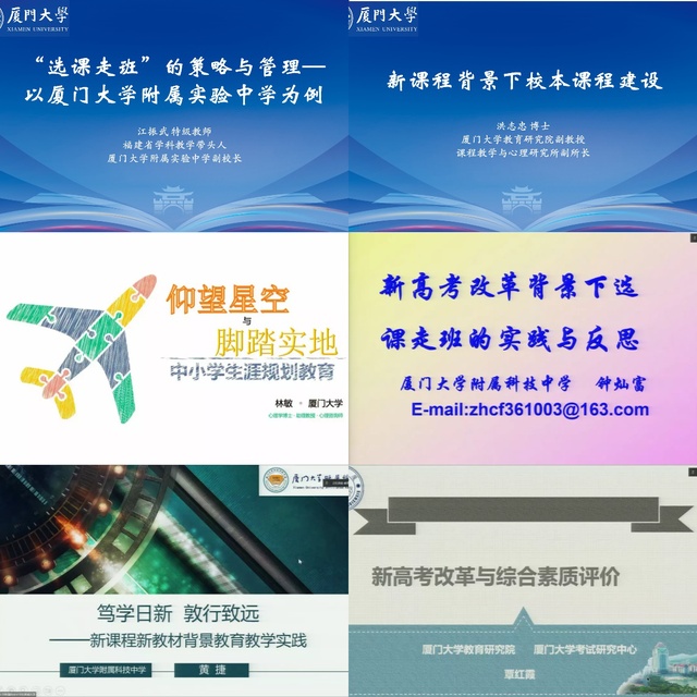 在专题研修班中,厦门大学附属科技中学副校长钟灿富,厦门大学附属实验中学副校长江振武,厦门大学附属科技中学教研室主任黄捷,厦门大学教育研究院副院长、教授覃红霞,副教授洪志忠和助理教授林敏六位专家受邀作专题报告,分别就新高考改革背景下的“选课走班”、综合素质评价与新高考招生模式,以及新课程背景下的校本课程建设、中小学生涯规划教育和教育教学实践进行系统阐述和深入讲解,为两县教育教学实践和教师发展培育提出指导建议。