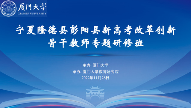 为深入贯彻党的二十大精神,积极参与国家乡村振兴战略,服务教育部实施高校县中托管帮扶项目,2022年11月26日-12月3日,由厦门大学主办、教育研究院承办的“宁夏隆德县彭阳县托管中学新高考改革创新骨干教师专题研修班”在线上开展。本次研修班采用线上教学方式,我院办公室吕铖担任班主任,来自宁夏回族自治区隆德县和彭阳县300名骨干教师及高中学生约1800人参与本次培训。