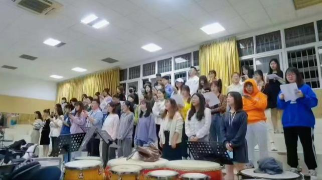 活动前期,我院文体中心积极筹备排练工作,1周进行1-2次合唱排练。在艺术学院蔡珺、郑怡两位小老师的悉心指导下,经过一个月的辛苦排练,大家配合默契,对歌曲的诠释与演绎逐渐丰满。