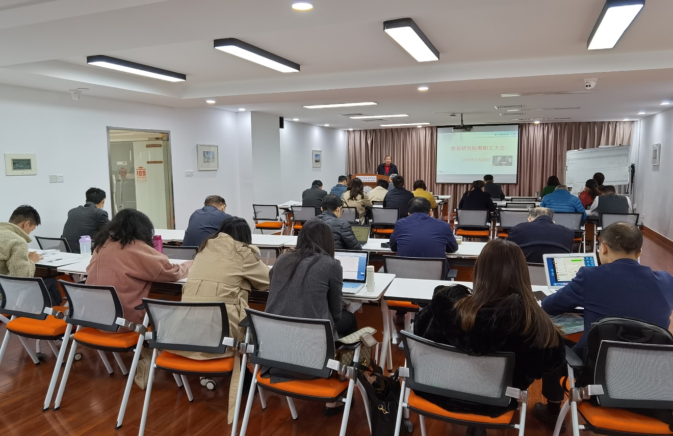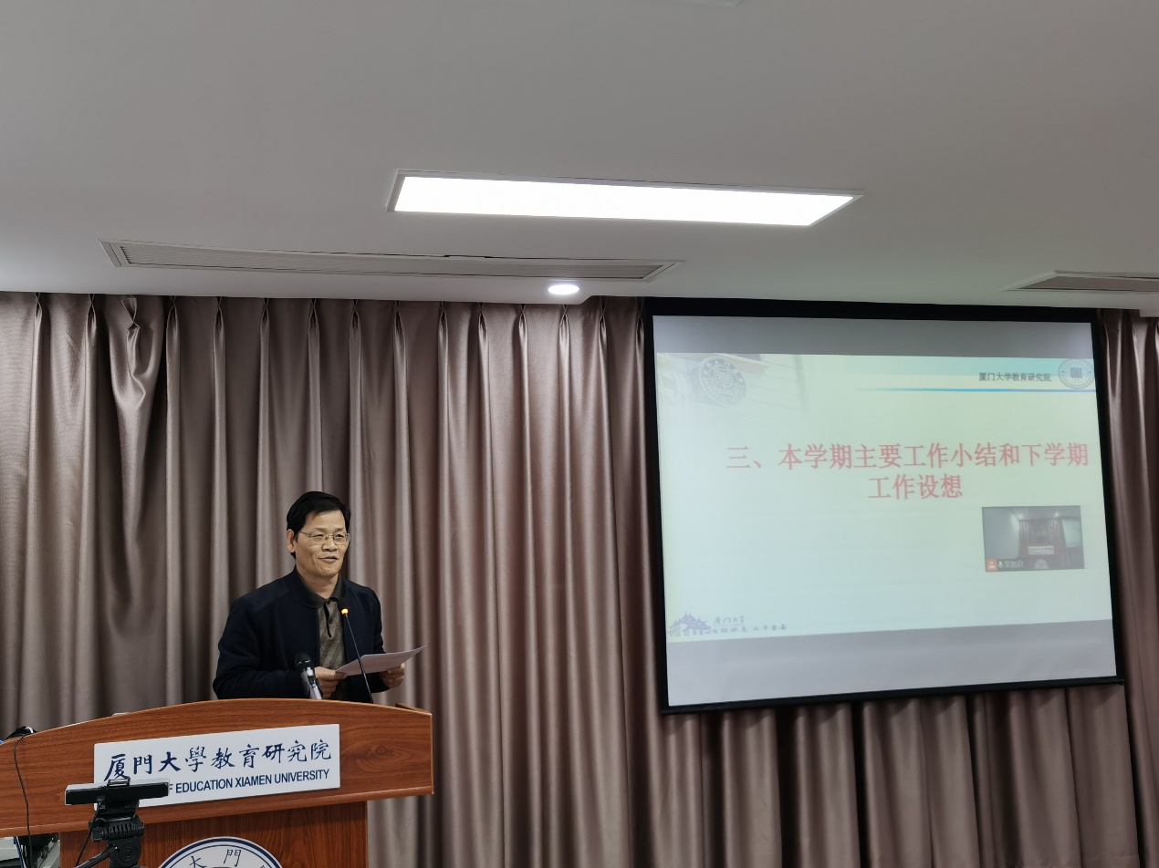 2021年12月20日上午,我院在海韵八610报告厅召开全院教职工大会。会议回顾了2021年工作情况及各项工作取得的成绩,同时也指出了当前工作中存在的问题和短板,并对2022年重点工作任务进行动员部署。院工会主席郭建鹏主持,潘懋元先生和全院教职工通过线上线下相结合的方式参加了会议。