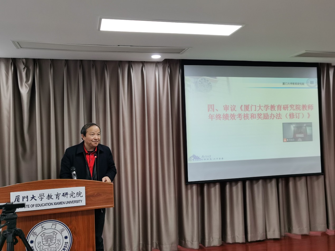 院长别敦荣就《教育研究院教师年终绩效考核和奖励办法》的修订情况进行了解读和说明。他表示,这项工作涉及教师的切身利益,将继续广泛征求意见,希望大家积极建言献策,为贯彻落实“破五唯”要求、完善教师工作绩效考核体系贡献智慧。