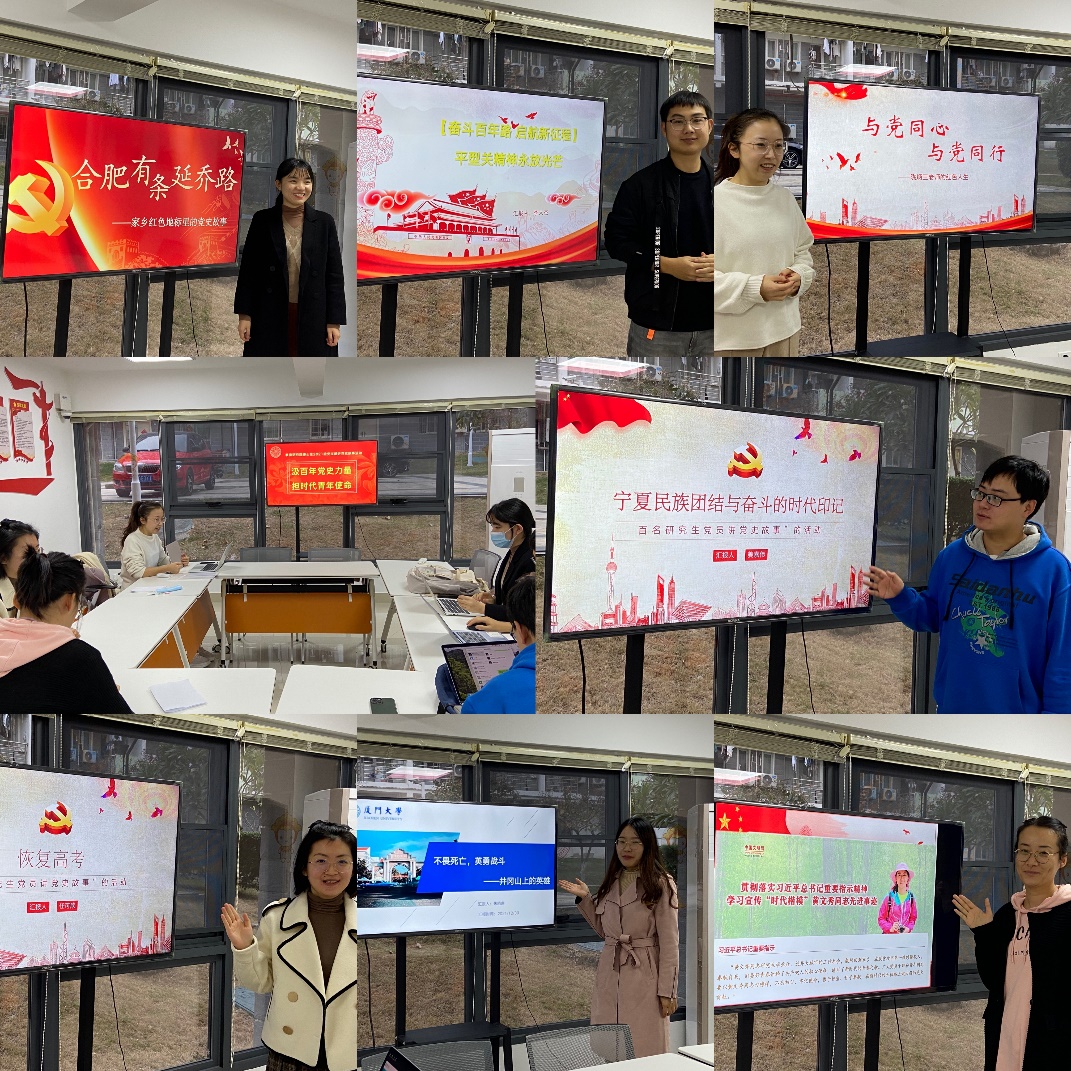 百年正青春,奋斗正当时。习近平总书记指出:“广大党员、干部和人民群众要很好学习了解党史、新中国史,守住党领导人民创立的社会主义伟大事业,世世代代传承下去。”为贯彻落实习近平总书记在党史学习教育动员大会上的重要讲话精神,从党的光辉历史中汲取砥砺奋进的精神力量,切实把“学史明理、学史增信、学史崇德、学史力行”的目标要求贯穿党史学习教育始终。教育研究院博士生2021级党支部于2021年12月30日在海韵9栋党团活动室,开展了讲党史故事活动。活动由博士生2021级党支部书记郑雅倩主持。