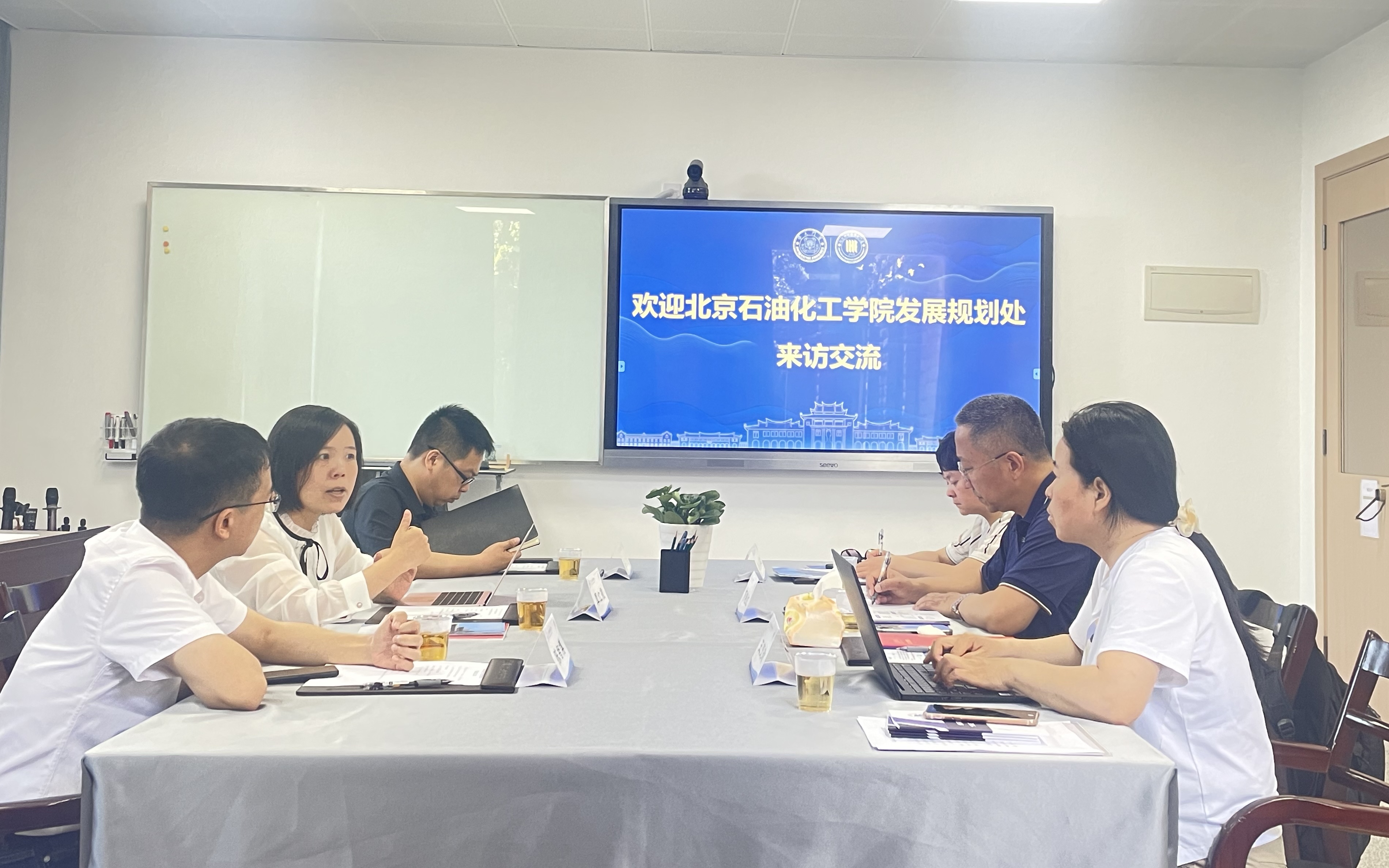 2023年5月29日上午,北京石油化工学院发展规划处处长何晓红一行到访我院。我校发展规划办副主任陈智博、我院副院长覃红霞教授和我院课程教学与心理研究所副所长洪志忠副教授参加座谈。