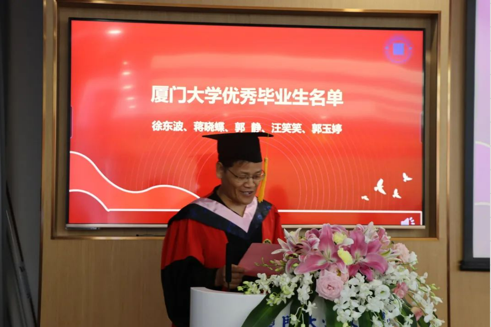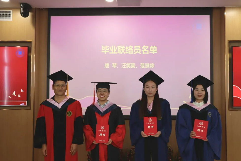 在聘任毕业年级联络员环节,王洪才副院长为被聘任为厦门大学2022届年级联络员的唐琴、汪笑笑、范慧婷等三位毕业生颁发了聘书。
