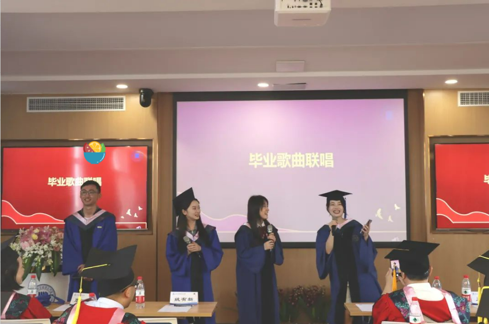 最后,孙略、张靖佶、刘曦东和欧妍四位毕业生上台为大家表演了毕业歌曲大联唱。在《凤凰花开的路口》的歌声中,教育研究院2022届研究生毕业典礼落下帷幕。