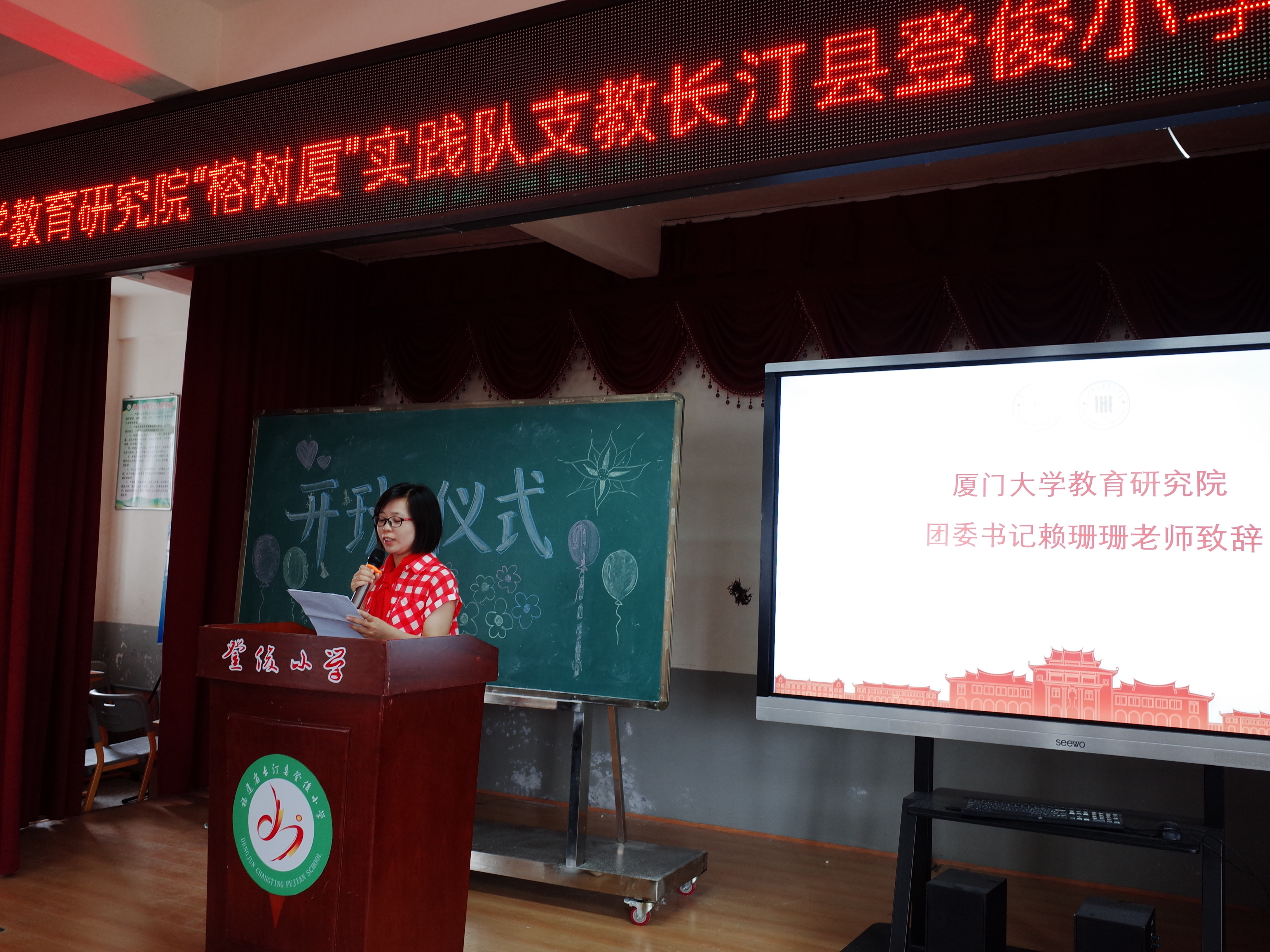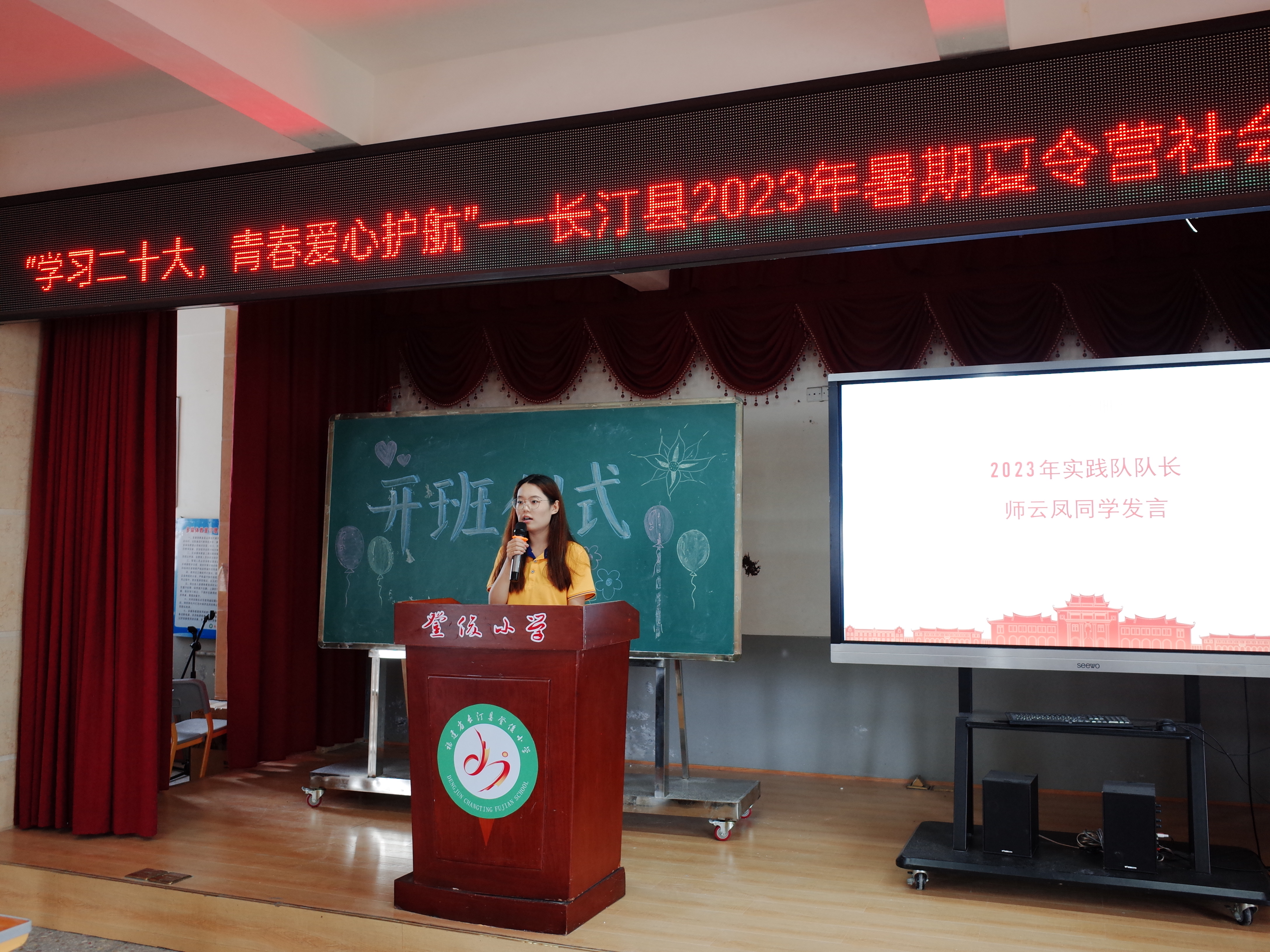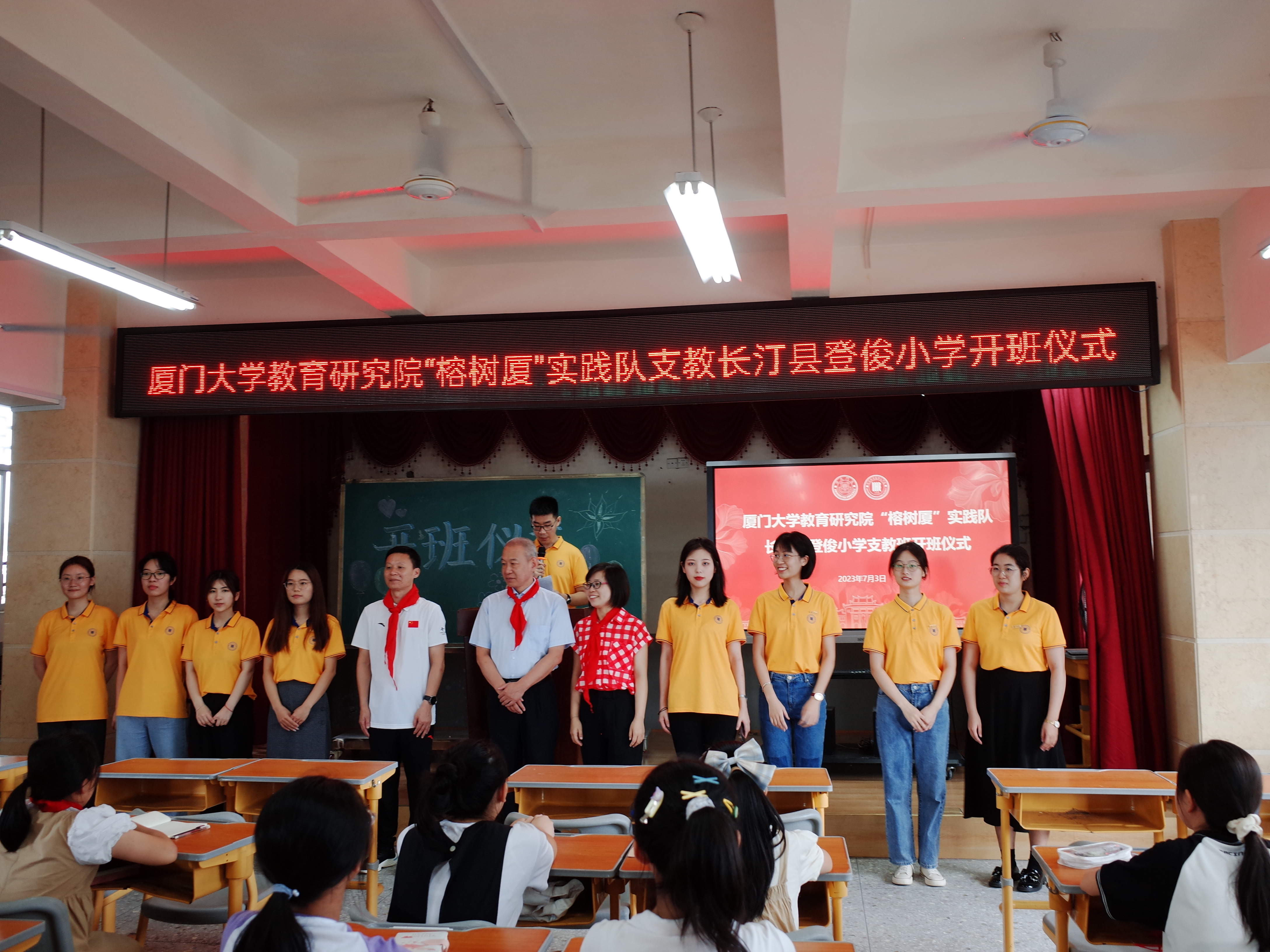 2023年7月3日上午,我院“榕树厦”暑期社会实践队走进登俊小学并举行简短的开班仪式。我院党委副书记姚有新、团委书记赖珊珊,长汀县登俊小学校长刘晓明、德育处主任陈冬水,以及“榕树厦”暑期社会实践队全体队员和登俊小学师生代表参加了开班仪式。仪式由“榕树厦”实践队队员赵一博主持。