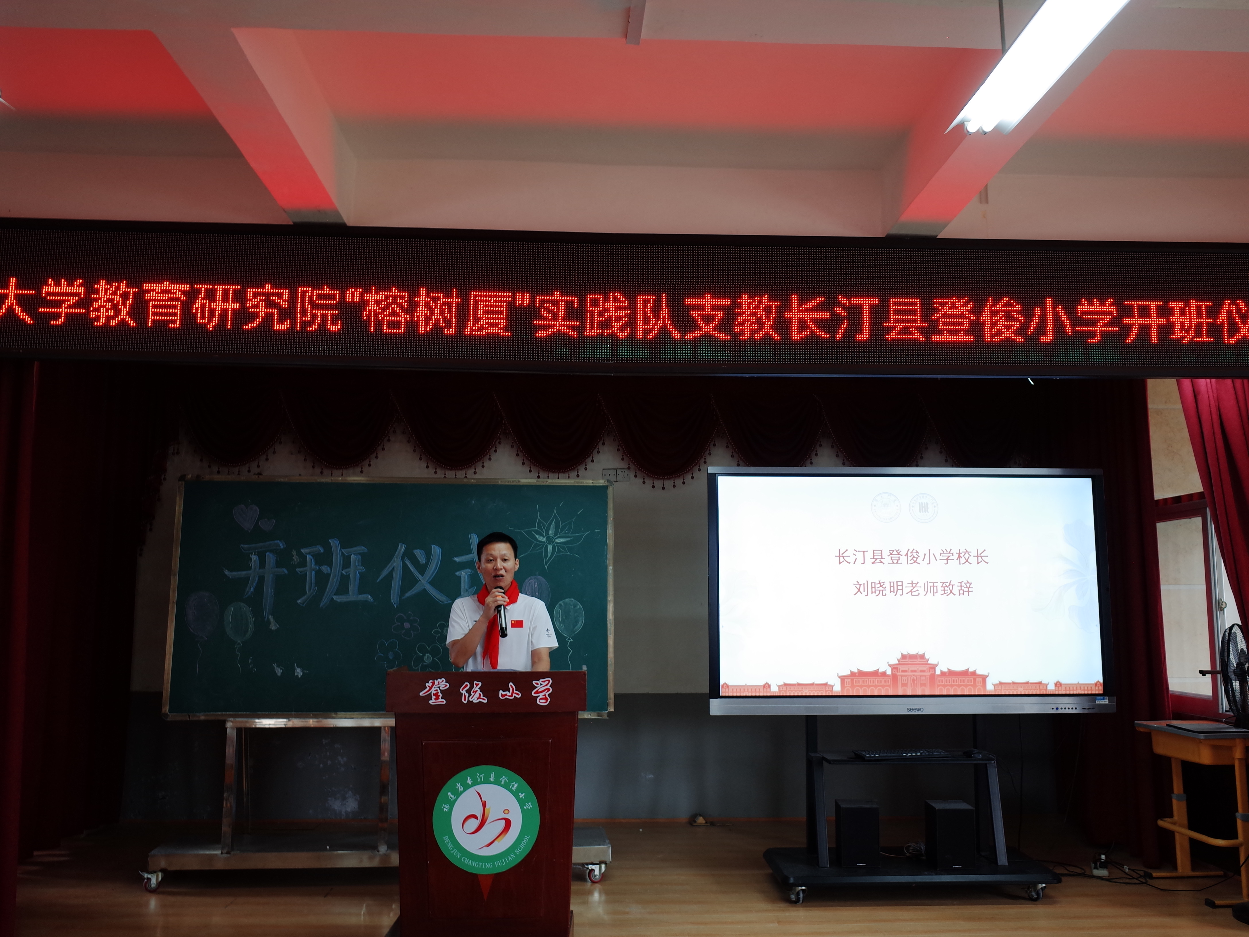 仪式在庄严的奏唱国歌中开始。刘晓明首先致辞,他对“榕树厦”暑期社会实践队的到来表示热烈欢迎,对两校共建的又一次支教活动表示祝贺与期待。他介绍了登俊小学的师资力量、办学状况、学校特色等,他寄语同学们在接下来的学习实践中要积极行动,不忘学习初心,牢记学习使命,知行合一,学有所获。