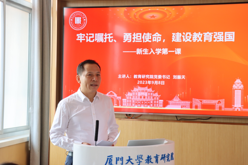 2023年9月8日上午,我院在黄宜弘楼502报告厅举行2023级新生入学第一课活动。院党委书记刘振天教授为2023级硕博研究新生带来了题为“牢记嘱托、勇担使命,建设教育强国”的新生党课,引导青年学生明确教育强国之重任,增强勇担建设教育强国大任的使命感与责任感,激励新生们扎实学好高等教育学、做好高等教育学。