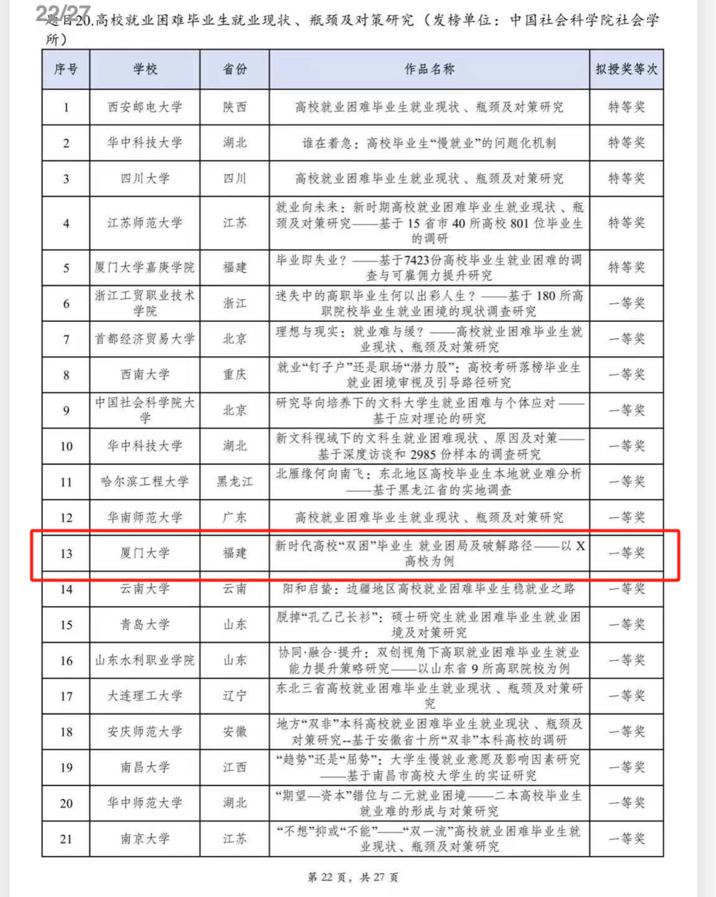 作为指导教师,我很高兴参与并见证了学生们在“挑战杯揭榜挂帅”专项赛中夺得了一等奖的全过程,这一成果的取得让我为他们深感骄傲。此荣誉不仅体现了学生们探索创新的能力,也展示了厦门大学教育研究院作为国家一流学科培养高素质创新型研究生人才的成果。在开展“高校就业困难毕业生就业现状、瓶颈及对策研究 ”这一主题的研究时,学生们展现出了杰出的团队协作能力和专业素养。他们不仅能灵活运用高等教育学的理论和方法,还能跳出常规思维,结合社会学、心理学等跨学科知识,从多学科、多角度加以分析并提出解决策略,从而确保了研究的深度与创新性。