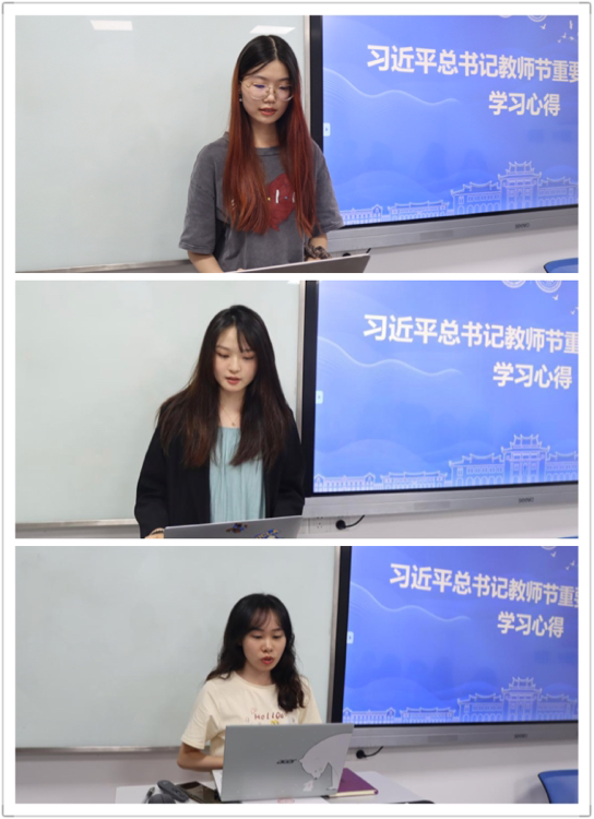 研习社成员代表金心怡、钟蕊坤、谭蓉同学分享习近平总书记致信全国优秀教师代表重要指示精神学习心得。金心怡同学表示,习近平总书记的重要指示立意高远、内涵丰富,充分体现了以习近平同志为核心的党中央对教育和教师的高度重视、特殊厚爱。作为从事高等教育研究的研究生,要在学习和研究过程中融入、践行习近平总书记重要指示精神,不辜负这个伟大时代的责任与使命。钟蕊坤同学强调,习近平总书记提出的关于中国特有的教育家精神,是在迈向强国建设和民族复兴的伟大新征程中,赋予新时代人民教师的崇高使命,为新时代加强和改进教师队伍建设指明了方向。作为未来的教育工作者,我们要做理想信念的坚守者、教育价值的追寻者,为新时代教师队伍建设贡献力量。谭蓉同学认为,我们敬爱的潘懋元先生,是著名教育家、中国高等教育学学科开拓者与奠基人、全国教书育人楷模、全国优秀教师,我们为能在潘先生耕耘奋斗过的厦大教育研究院学习倍感自豪,也深感责任重大,我们要进一步学习领会教育家精神的深刻内涵,继承和发扬潘懋元先生的精神品格,让“大先生”的治学态度、崇高风范、育人情怀代代相传。