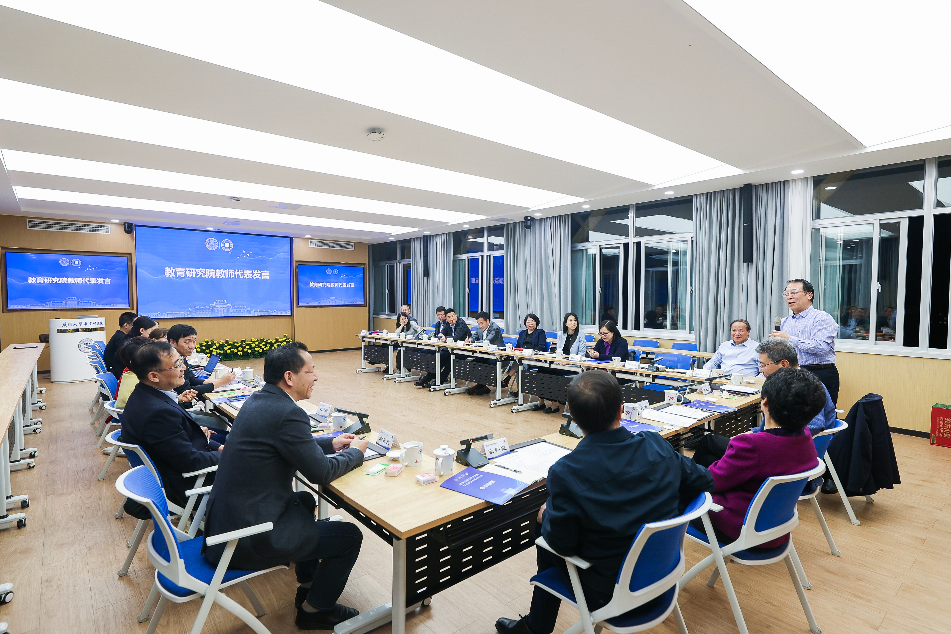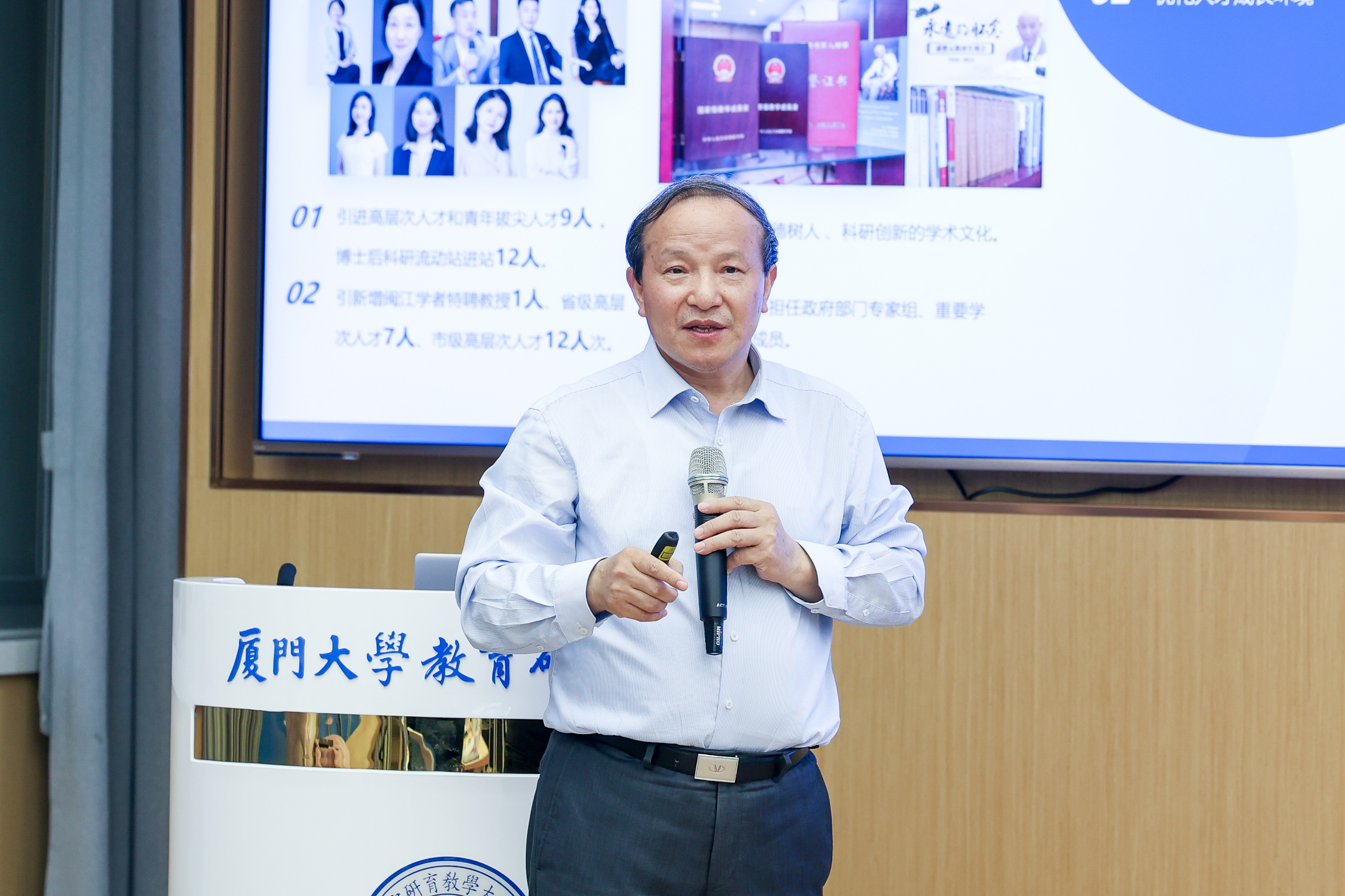 教育研究院院长别敦荣介绍了厦门大学教育研究院一流学科建设工作情况,总结了研究院在师资队伍建设、人才培养、科学研究、咨政服务、国际交流以及办学条件改善等方面所取得的突出成就,强调在一流人才队伍建设、中青年学科带头人培养、新兴高教研究领域开拓和国际交流合作等方面仍有提升空间。教师代表发言分享了自己的主要研究领域和取得的主要研究成果,展现了教育研究院教师队伍的多样性、研究实力和发展潜力。