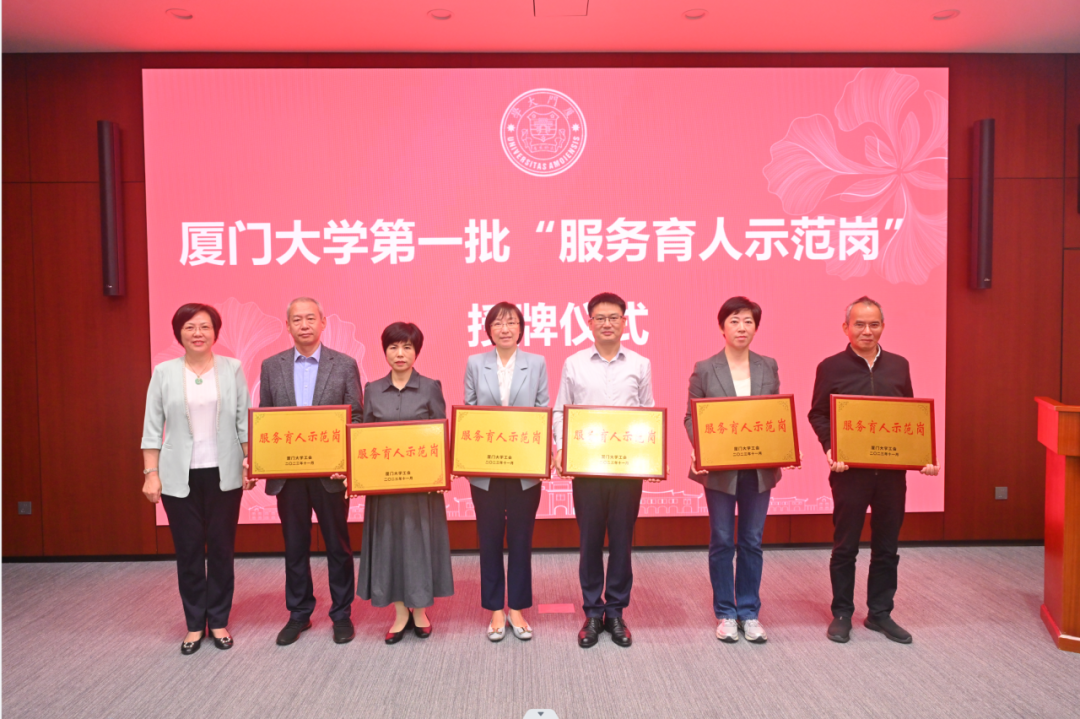 为落实立德树人根本任务,强化“三全育人”工作成效,2023年12月12日,厦门大学第一批“服务育人示范岗”单位集体及个人授牌仪式在颂恩楼220会议室举行,校党委常委、副校长、工会主席邓朝晖为获评“服务育人示范岗”单位集体的我院党政与专技支撑团队授牌。院党委副书记姚有新作为团队代表参加授牌仪式。