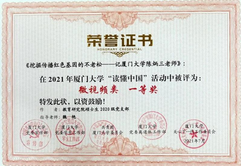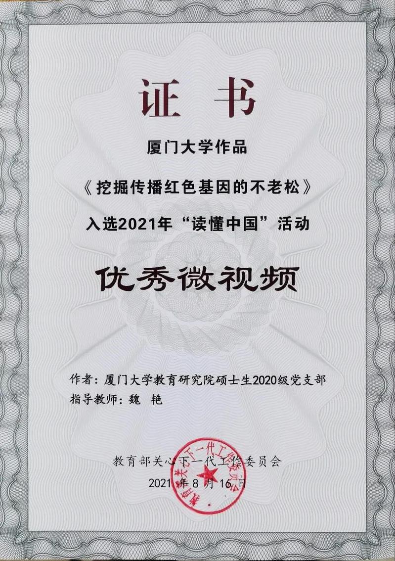 近日,教育部关工委2021年“读懂中国”活动评审结果揭晓,我院由硕士研究生2020级党支部创作的《挖掘传承红色基因的不老松》,从全国350个微视频作品中脱颖而出,成为30个优秀微视频获奖作品之一。同时,该作品也获得了厦门大学2021年“读懂中国”微视频组一等奖。