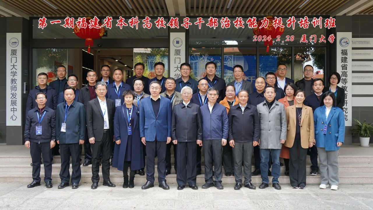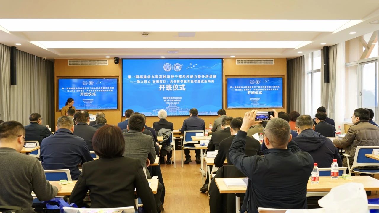 2024年2月28日,由福建省高等教育研究院、厦门大学教育研究院、厦门大学高等教育发展研究中心举办的第一期福建省本科高校领导干部治校能力提升培训班,在厦门大学黄宜弘楼502报告厅隆重开班。中国高等教育学会副会长管培俊,福建省教育厅专职副总督学(副厅级)黄建顺,厦门大学副校长方颖等出席开班仪式。来自全省本科高校的24位领导干部参加本期培训,开班仪式由福建省高等教育研究院副院长鲍威主持。