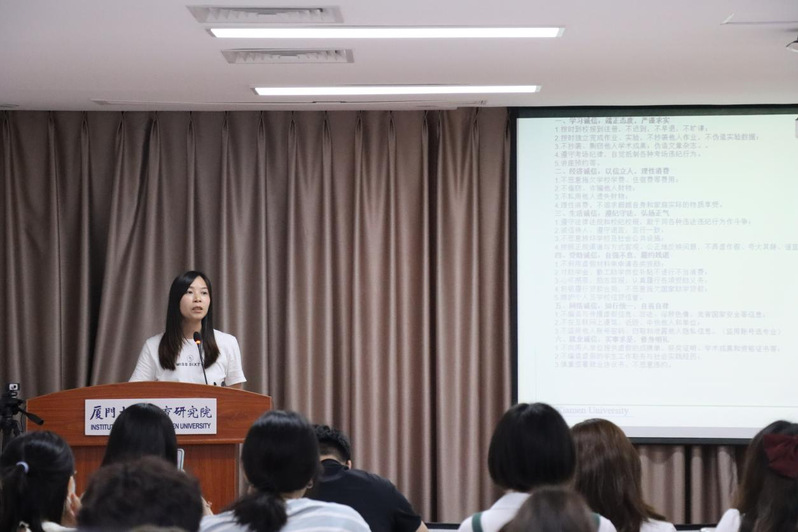 随后,院团委书记魏艳老师对校规校纪、校园安全及有关学生工作规定进行了解读,并就开学典礼、学术诚信、考试纪律、住宿要求、防疫规定等要求逐一进行说明,她着重强调了防盗、防诈骗等安全注意事项,提高同学们安全防范意识以及应对突发事件的能力。最后,魏老师真切地希望同学们之间可以相互帮助,友爱和谐,在厦大共同度过美好的校园时光。