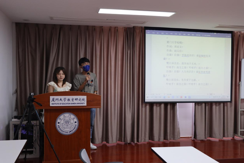 利用课间休息时间,在院研究生会闵叶子同学带领下,新生同学饶有兴趣地学唱了《厦门大学校歌》。学唱校歌是每一个新生感悟校园文化、认同学校精神、提升学校归属感的重要过程。