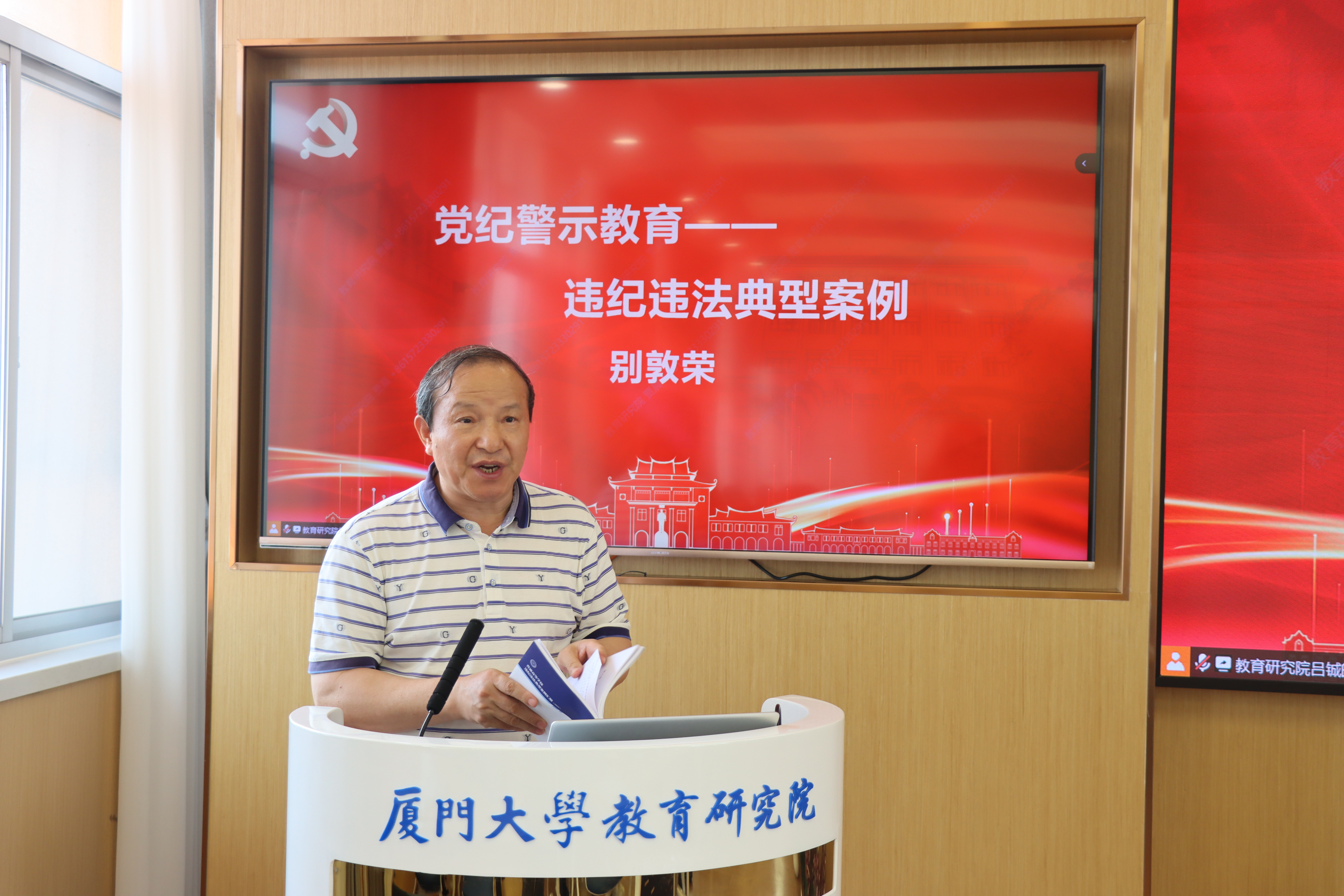 院党委副书记、院长别敦荣作党纪警示教育。他以高校违纪违法典型案例为鉴, 结合实际 进行 警示教育,开展以案说德、以案说纪、以案说法、以案说责,深刻剖析违纪案例,以身边事教育身边人, 强化警示 震慑 。他强调,各党支部必须切实担负起责任,督促党员同志们深入学习、全面理解党的纪律,强化党员的纪律意识,提升自我约束能力。