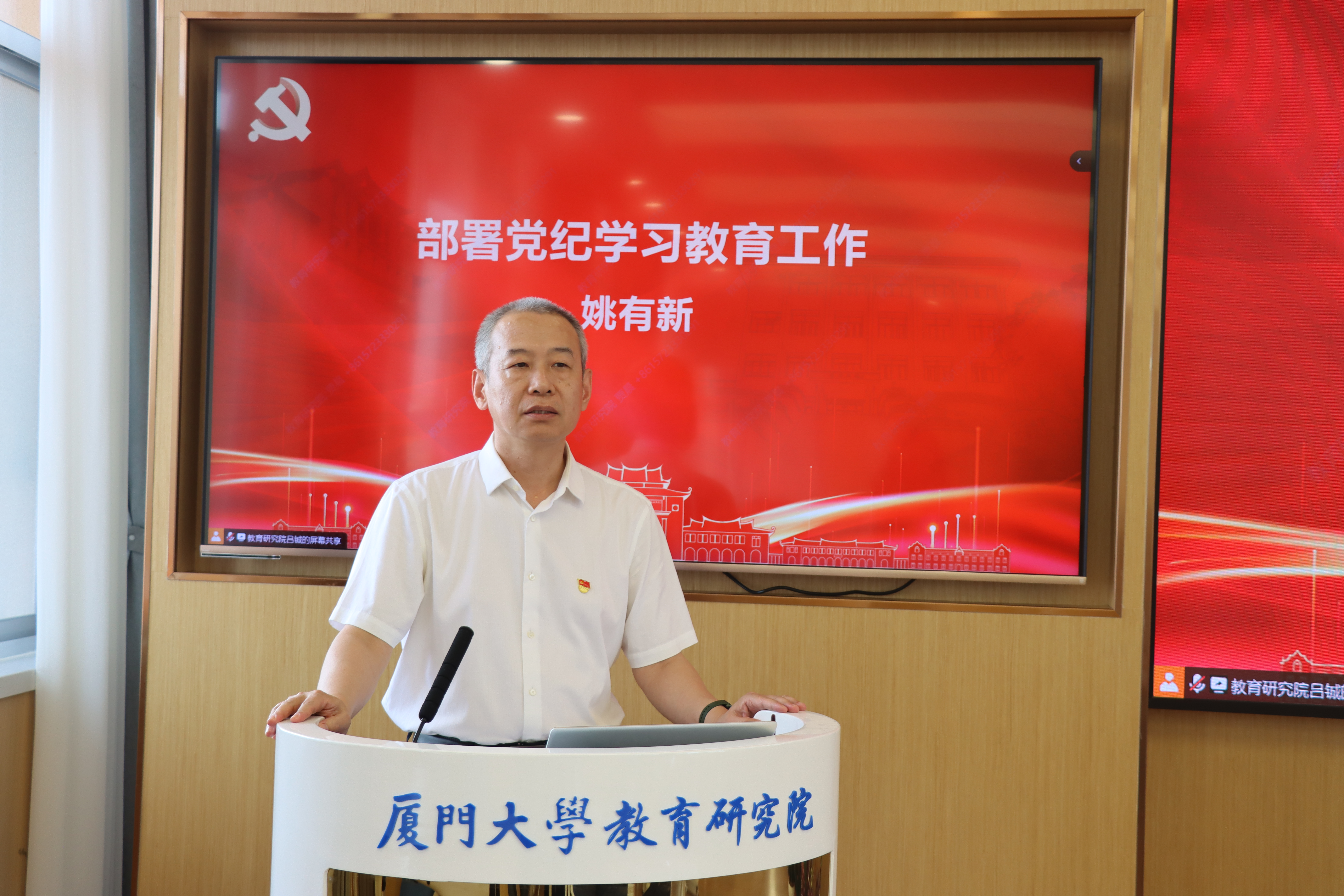院党委副书记姚有新对院党纪学习教育工作进行部署。他指出,党纪学习教育从2024年4月持续至7月,各支部及党员要将党纪学习教育注入日常、抓在经常,充分发挥福建作为习近平新时代中国特色社会主义思想重要孕育地和实践地的优势。他要求,各支部要认真贯彻落实《厦门大学教育研究院党纪学习教育实施方案》,一是要坚持原原本本学,推动《条例》入脑入心;二是要加强警示教育,让党员、干部受警醒、明底线、知敬畏;三是要加强解读和培训,深化《条例》理解运用。充分利用院网站、公众号、电子显示屏等媒介,对《条例》的重要意义、主旨要义等内容进行解读。