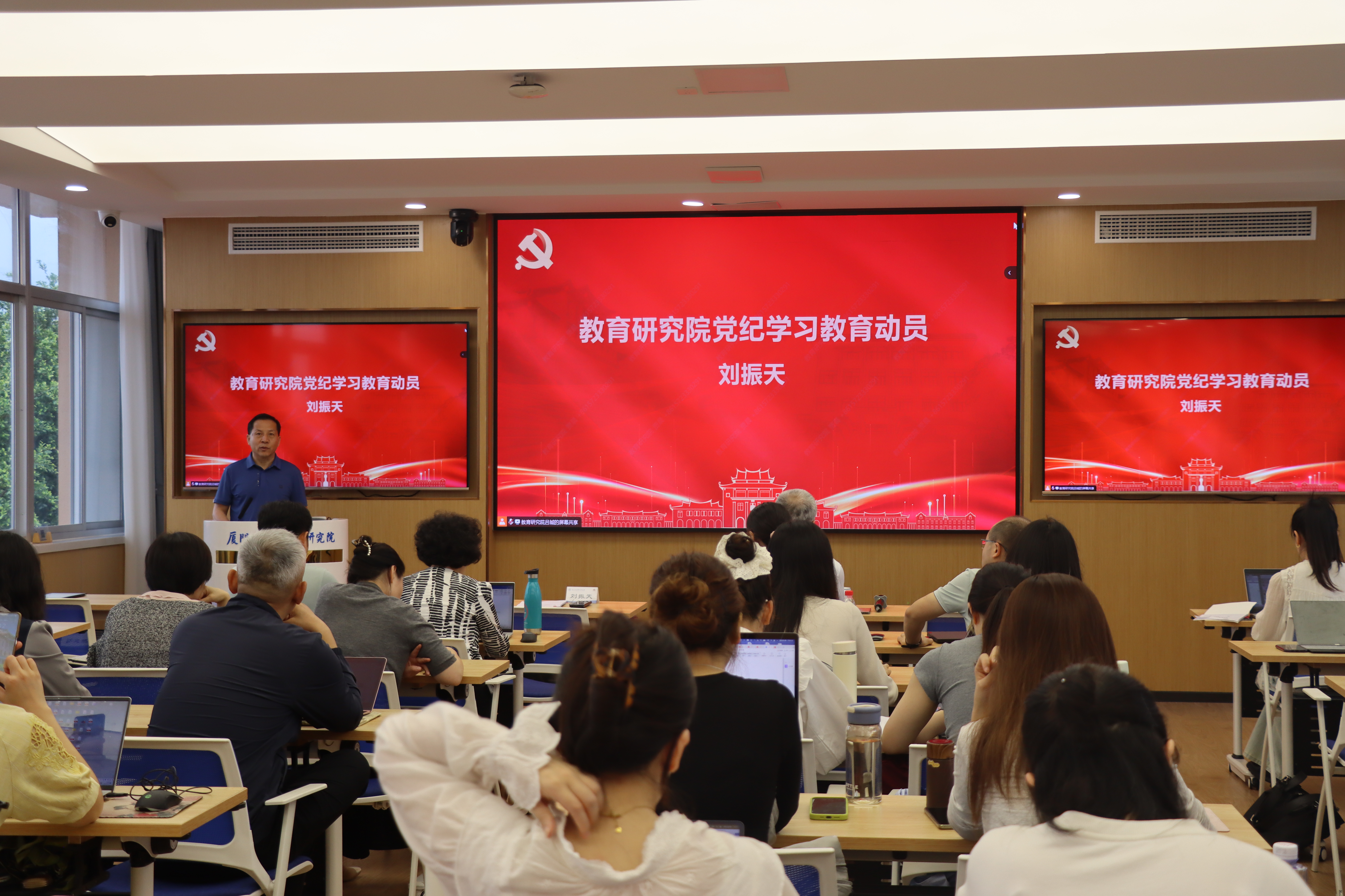 4月22日下午,教育研究院党委召开党纪学习教育动员会暨党委理论学习中心组(扩大)学习,深入学习贯彻党中央关于在全党开展党纪学习教育的有关要求,对全院开展党纪学习教育进行动员部署,并开展党纪学习教育专题党课和警示教育。会议由院党委书记刘振天主持,院党政领导班子、党委委员、全体师生党员及积极分子在黄宜弘楼502、211、210、401室参加会议。
