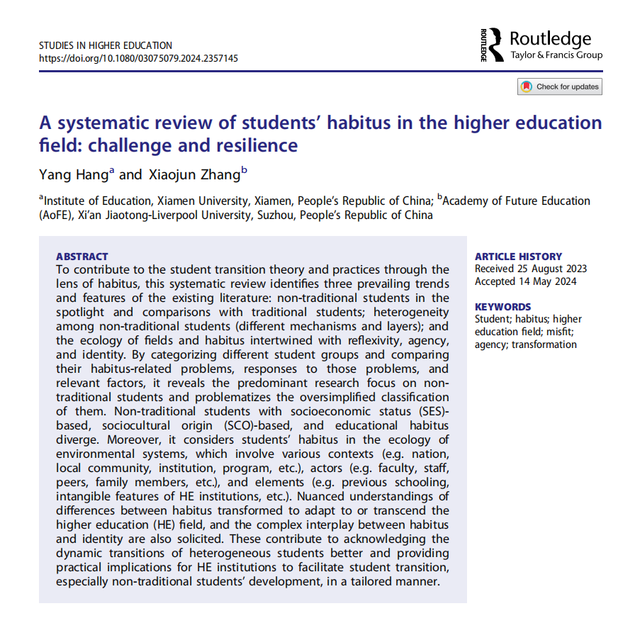 近日,我院杭洋博士后在国际高等教育权威刊物《Studies in Higher Education》上发表题为“A systematic review of students’ habitus in the higher education field: challenge and resilience”的学术论文。该研究对高等教育场域内大学生惯习相关文献进行综述,总结了现有研究的三个主要趋势和特点,深化了学界关于大学生动态过渡和异质性的认识。