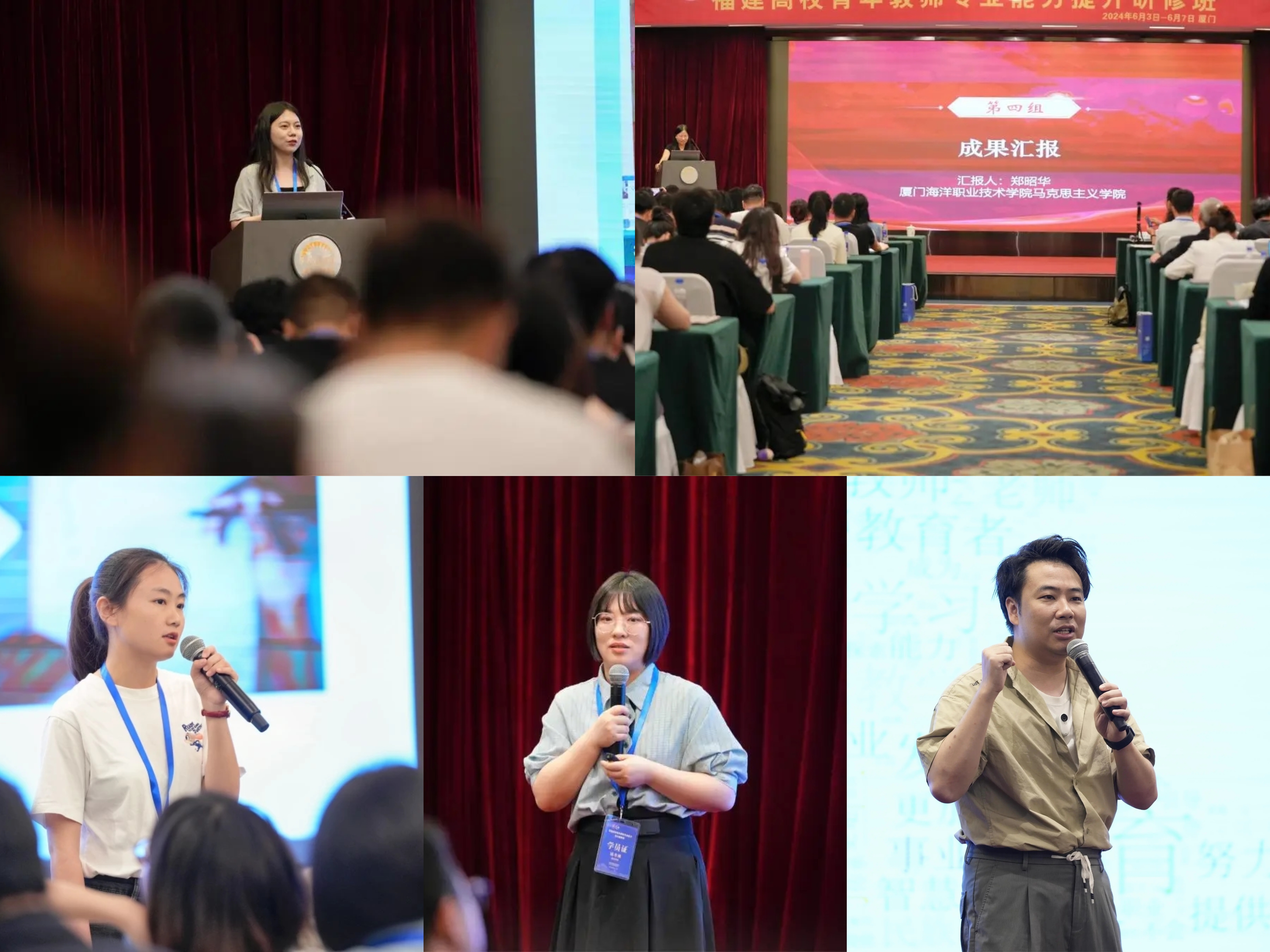 成果汇报环节,各组学员代表依次登台畅谈研修感受。华侨大学傅超萍老师就“教学和科研的时间分配”“不同专业教学及科研面临的困境”“教学竞赛经验分享”等三个核心议题进行了汇报展示。莆田学院钱静老师针对“教师教学工作中的挑战”“科研与教学的平衡”“工作与生活的平衡”等话题做了深入探讨和成果分享。阳光学院陈冬琳老师从教学育人、学科竞赛和科研成果三个层面探讨青年教师职业生涯:挑战、探索与成长之路。厦门海洋职业技术学院郑昭华老师围绕“什么是好老师”“什么是课程思政”“教学和科研的关系”,声情并茂地分享感悟。漳州理工职业学院林庆滨老师从“为何而师”“何而为师”“将为何师”三个维度深入剖析了教师的角色定位与发展路径,并带领全体参训学员呐喊“福建‘青椒’,很OK”。