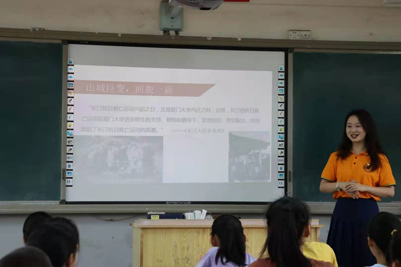 2021年6月30日,是实践队抵达长汀的第三天,实践队全体成员以饱满的工作热情继续投入到支教活动中。上午八点三十分,实践队队员张靖佶为同学们带来了一堂别出心裁的“历史课”,通过观影、讲述和知识竞答的形式带领着同学们深情回顾了抗战时期厦门大学内迁长汀办学的珍贵历史,展现了厦大与长汀之间深厚的校地“山海情”,队员张靖佶在黑板上书写下了厦大“自强不息、止于至善”的校训,邀请同学们一起阐释校训背后的涵义,希望大家可以明其理、领其义、续其缘。最后,针对本节课的内容,还组织进行了丰富的知识竞答环节,同学们十分积极地参与到竞答中来,现场气氛热烈且欢快。今年是厦门大学建校一百周年,通过重温厦大内迁长汀的这段历史,能够展现百年厦大的辉煌历程,展现厦大新百年征程的决心和信心,同时将自强自立的火种播种到长汀的孩子们心里,激励他们感悟自强精神、追寻先辈足迹。