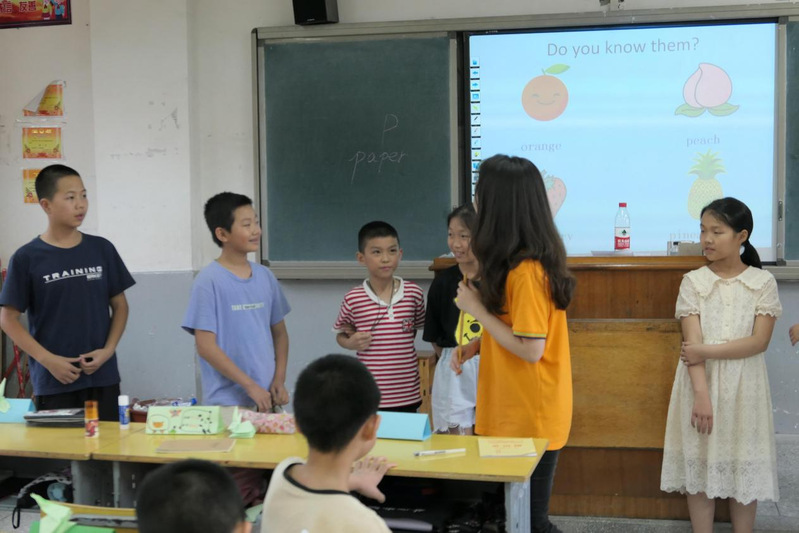 6月29日下午实践队成员揭雨晨、李文婷了带来趣味纷呈的手工课,队员张靖佶、孙略带来了别开生面的英语课。手工课上,在队员的指导下,同学们在五颜六色的卡纸上画出自己喜欢的各种图案,接着写上自己的姓名与班级,制作出属于自己的独特姓名牌,孩子们充分运用自己的想象力,完成了一件件精美的成品,体会到了动手创作的快乐。紧接着,同学们迎来了期盼已久的趣味英语课。在课上,队员们制作的精美英语课件“My Favorite Fruit”深深吸引了学生们的眼球,在教授水果英文单词的同时,通过单词竞赛和“萝卜蹲”的小游戏,带领同学们在欢声笑语中学会了许多陌生的水果类英文单词及一些常用英语句式。