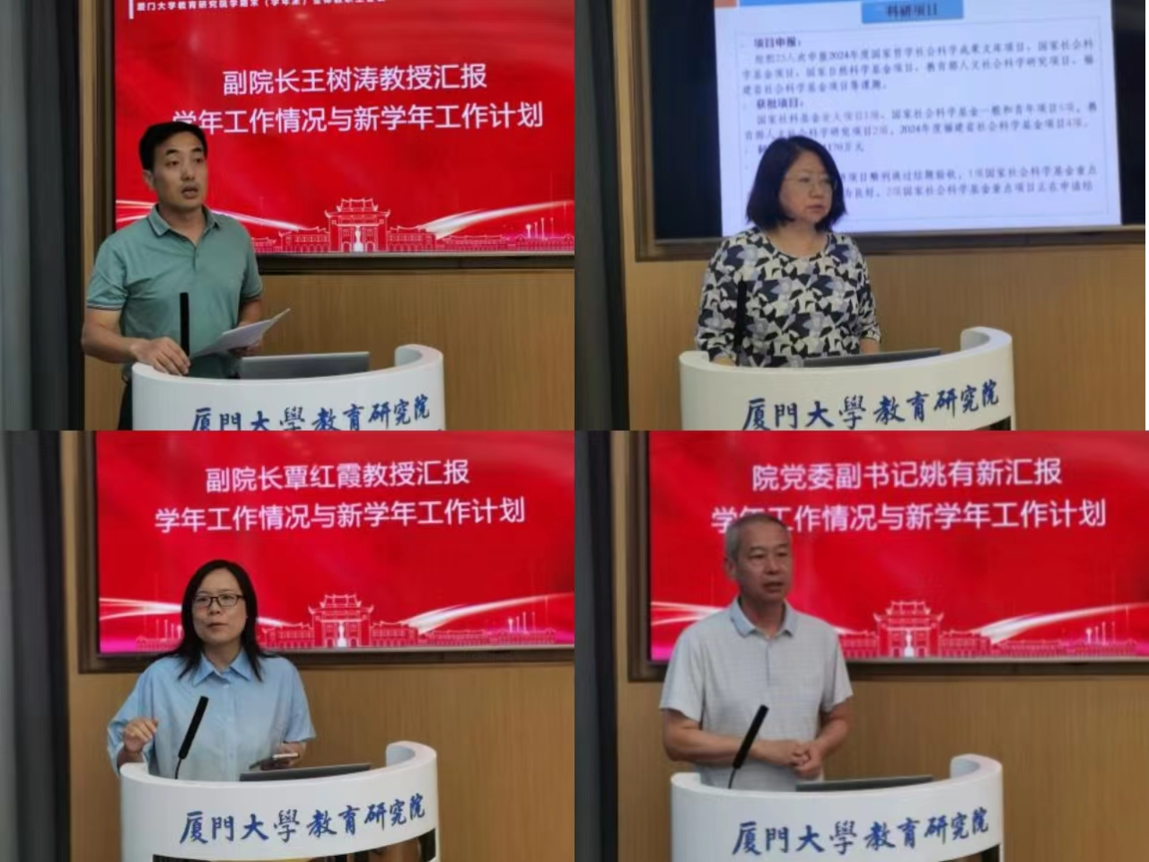 教育理论与历史研究所所长赵婷婷、教育发展与治理研究所所长徐岚、课程教学与心理研究所副所长洪志忠、比较与国际教育研究所所长吴薇分别汇报各研究所本学年以来的工作情况与新学年工作重点。