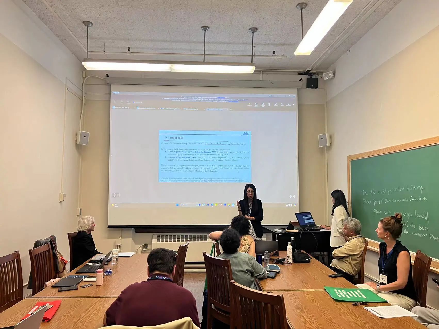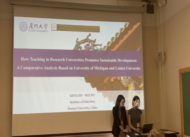 金心怡硕士生和吴薇教授共同报告了《研究型大学的教学何以促进可持续发展——基于密歇根大学和莱顿大学的分析》(How Teaching in Research Universities Promote Sustainable Development: A Comparative Analysis Based on University of Michigan and Leiden University)。报告探究了密歇根大学和莱顿大学通过其教学促进可持续发展的具体实践及主要特点。