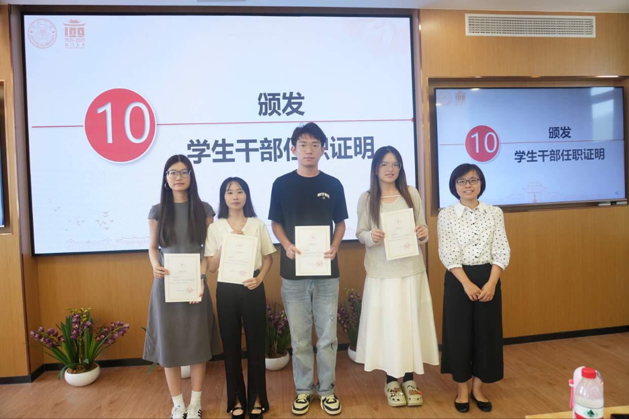 赖珊珊向教育研究院学生干部颁发任职证明,姚有新为“优秀学生干部”获得者颁奖。