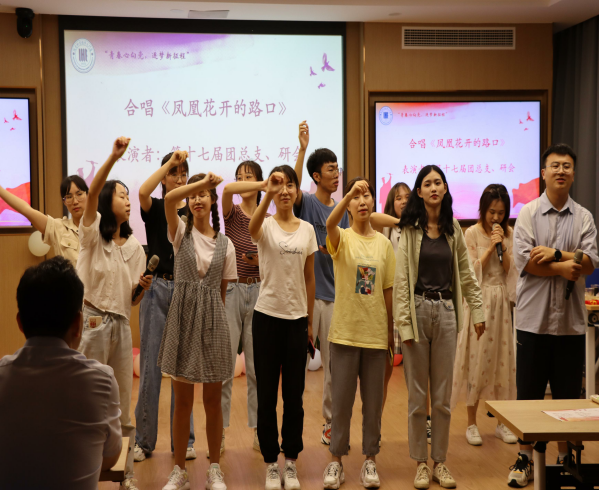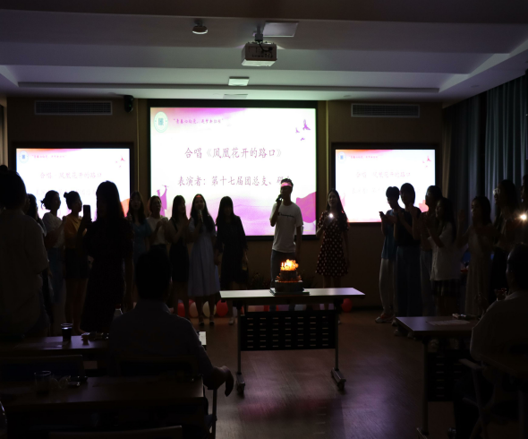 晚会的尾声,第17届团总支和研究生会成员为全体毕业生带来了精心准备的歌曲《凤凰花开的路口》,在演唱间奏中,推出了为毕业生准备的惊喜——蛋糕,并邀请全体毕业生上台演唱,在歌曲的最后喊出“祝学长学姐,毕业快乐”的祝福。毕业生们彼此拥抱,眼眶含泪,抒发着对离别的不舍和对彼此未来的祝福。
