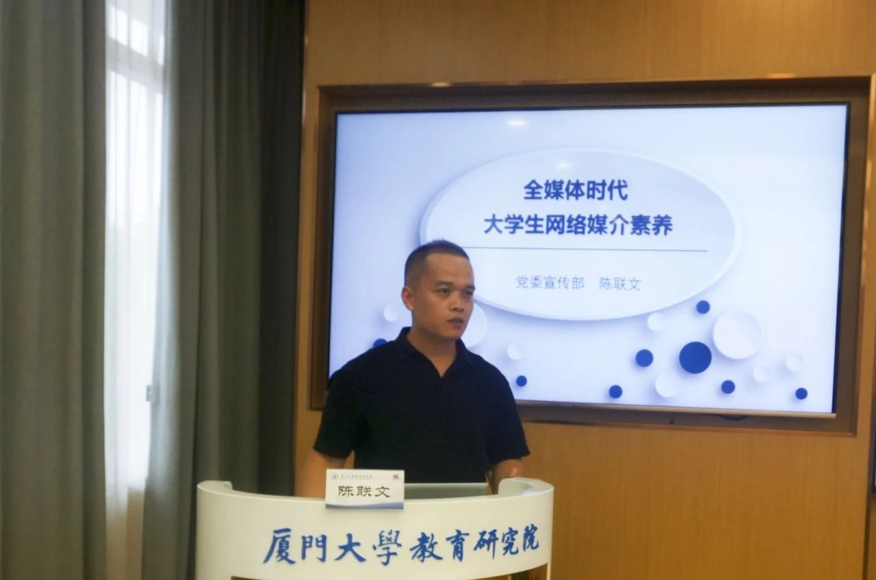 全媒体时代对当代大学生的核心素养提出了更为全面、广泛的要求,为贯彻落实“时代新人铸魂工程”,进一步提高学生的网络安全意识和媒介素养,增强教育研究院学生骨干队伍的综合素质,11月18日,教育研究院邀请厦门大学党委宣传部陈联文老师为学生骨干开展专题培训。教育研究院研究生会全体同学、各学生党支部支委、各班级班委、院学生助理团队等参加培训。培训由教育研究院团委书记赖珊珊主持。