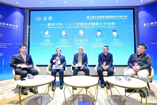 在圆桌论坛环节,莫家豪,Cary Anderson,李礼,以及国家数字化学习工程技术研究中心副主任、华中师范大学吴砥教授以“人工智能技术赋能大学治理”为主题进行交流讨论,分享大学治理的具体做法。圆桌论坛由厦门大学教育研究院副院长王树涛教授主持。
