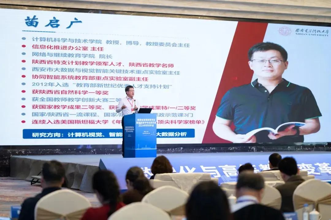 西安电子科技大学信息化推进办公室主任苗启广教授作了题为“数据驱动 协同智能,重塑数字教学新形态”的报告。他从教育数字化智能化、数智赋能教学管评两方面展开详细论述。他结合西安电子科技大学在“人工智能+教育”建设过程中的创新探索与实践成果,从“教”的精准化、“学”的个性化、“管”的高效化以及大语言模型在教育中应用等方面,详细分析了高等教育数字化转型的实践和路径。