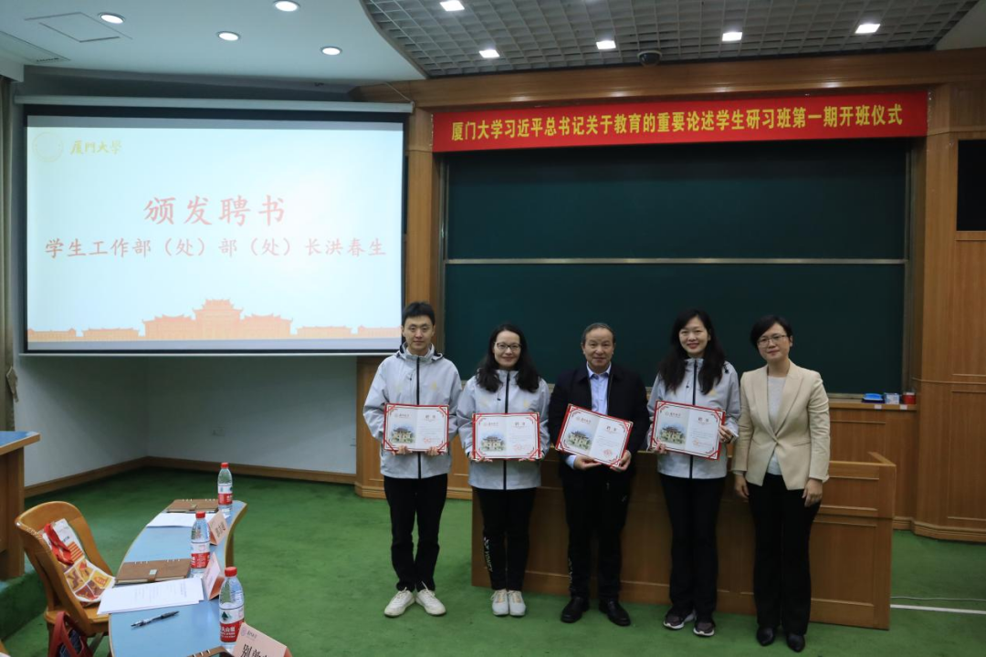 洪春生为厦门大学习近平总书记关于教育的重要论述学生研习班授课教师代表、指导老师代表颁发聘书。