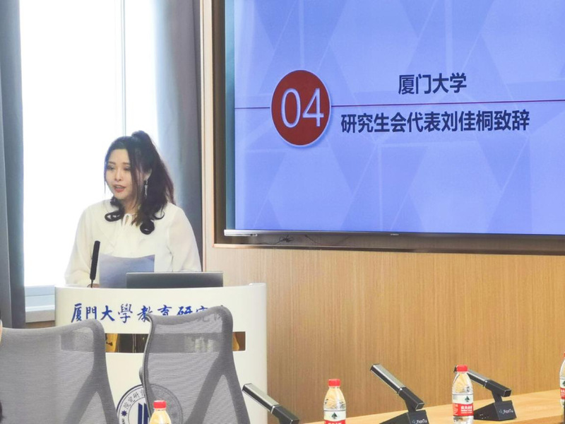 厦门大学研究生会执行主席刘佳桐同学在致辞中,肯定了教育研究院研究生会在学生生活、学术会议、社会实践、校园文化、校院互动、跨院交流等方面所做出的成绩,她希望新一届教育研究院研究生会再接再厉,在继承与创新中永葆生机和活力。