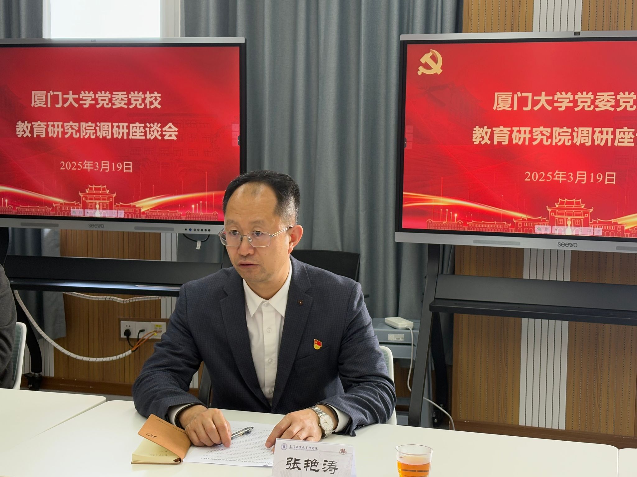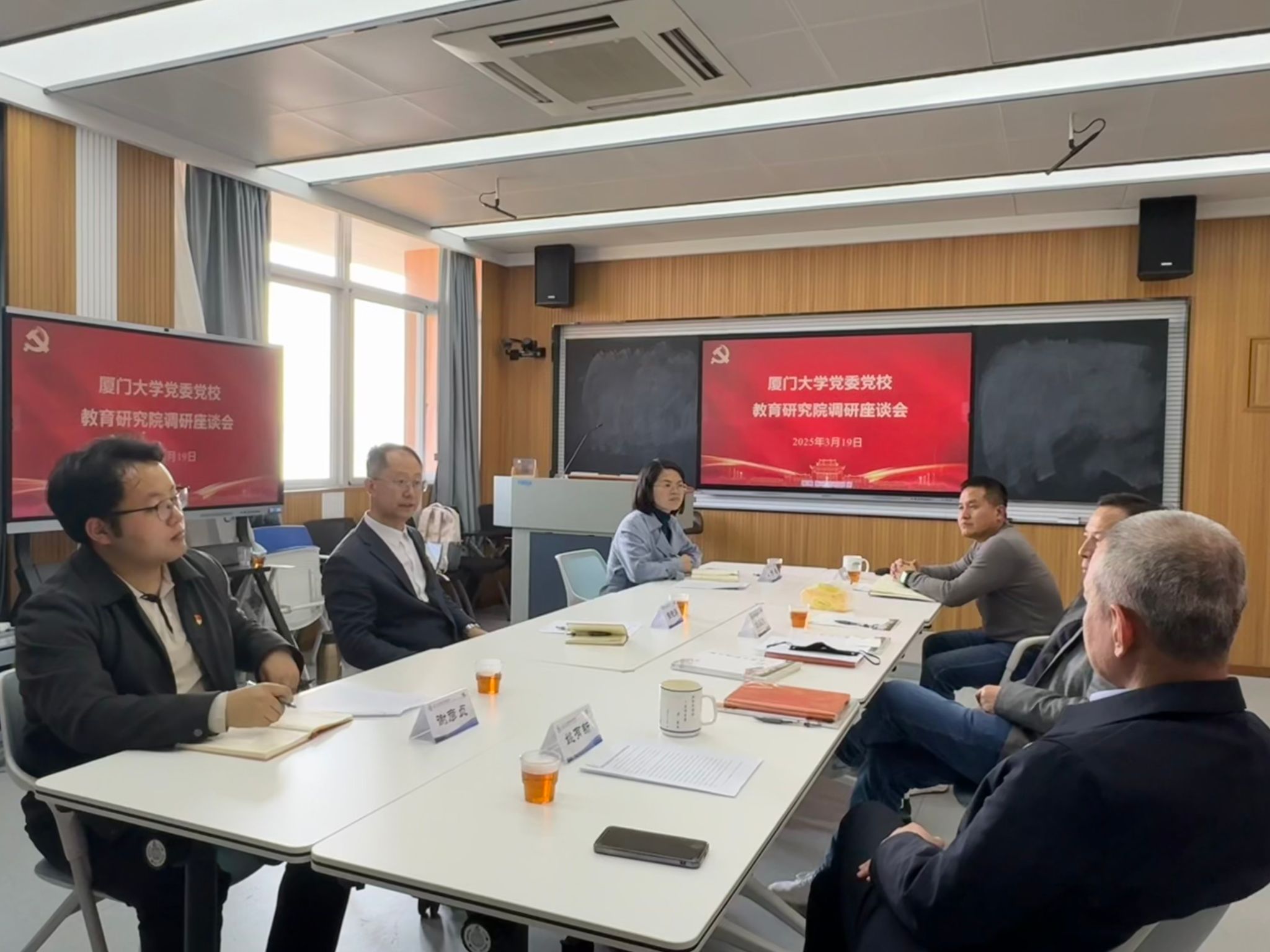 为深入学习贯彻党的二十届三中全会精神,充分了解基层党委党员和干部教育培训开展情况,2025年3月19日下午,厦门大学党委党校副校长张艳涛教授一行莅临教育研究院调研,座谈会在黄宜弘楼401室召开,教育研究院党委书记刘振天主持会议,校党委党校秘书谢媛、谢彦贞,院党委副书记姚有新、党务秘书吕铖参加会议。