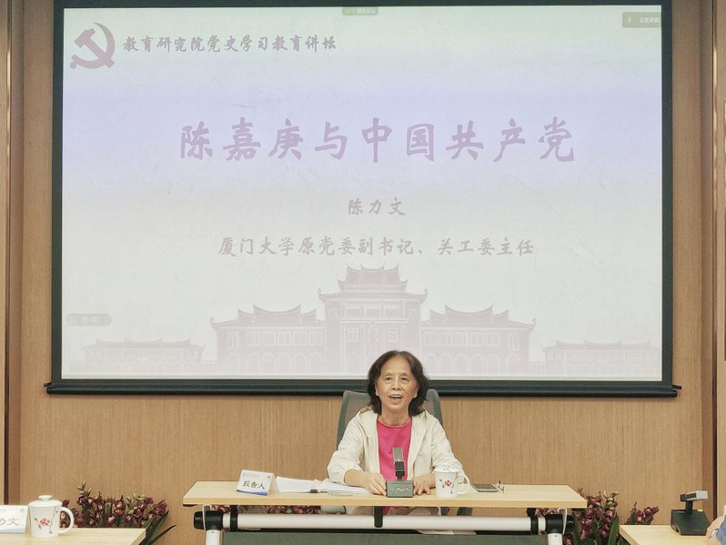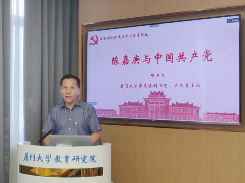 5月31日下午,教育研究院党史学习教育讲坛系列活动暨党委理论学习中心组第二讲在院502报告厅举行。厦门大学原党委副书记,校关工委主任陈力文应邀为我院师生作“陈嘉庚与中国共产党”专题讲座。论坛由院党委书记刘振天主持,校党委组织部副部长乔连全、院党政领导班子成员以及全院师生参加讲坛。