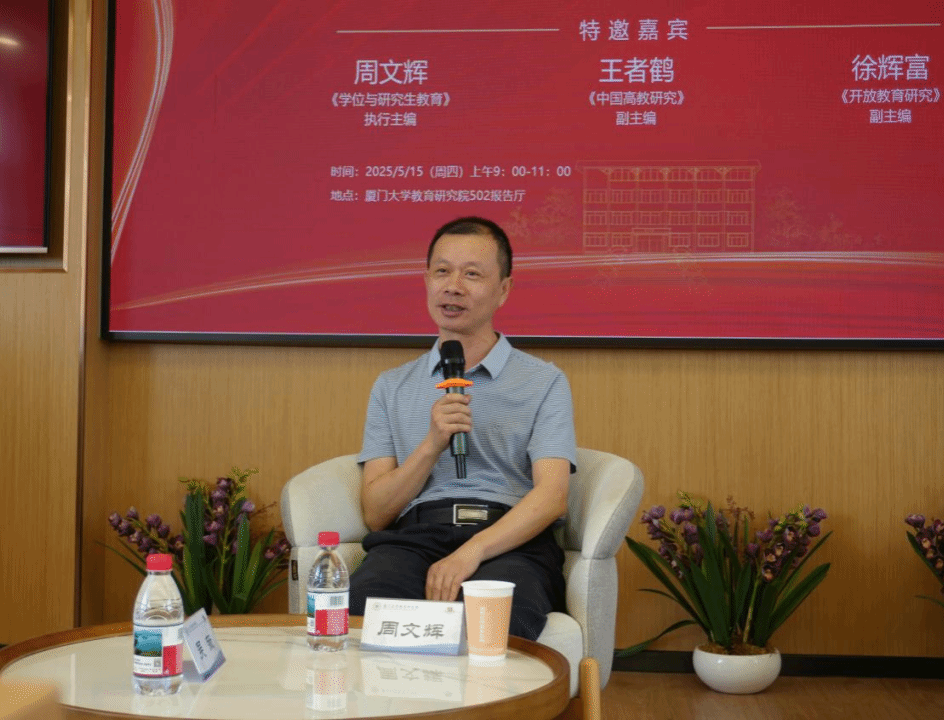 5月15日上午,厦门大学教育研究院在黄宜弘楼502报告厅举行建院47周年学术周“期刊主编面对面”专题会。此次专题会以“学术论文选题与写作指导”为主题,特邀《学位与研究生教育》执行主编周文辉、《中国高教研究》副主编王者鹤和《开放教育研究》副主编徐辉富三位嘉宾与我院师生进行面对面交流。会议由厦门大学高等教育发展中心副主任、教育研究院比较与国际教育研究所所长吴薇教授主持。