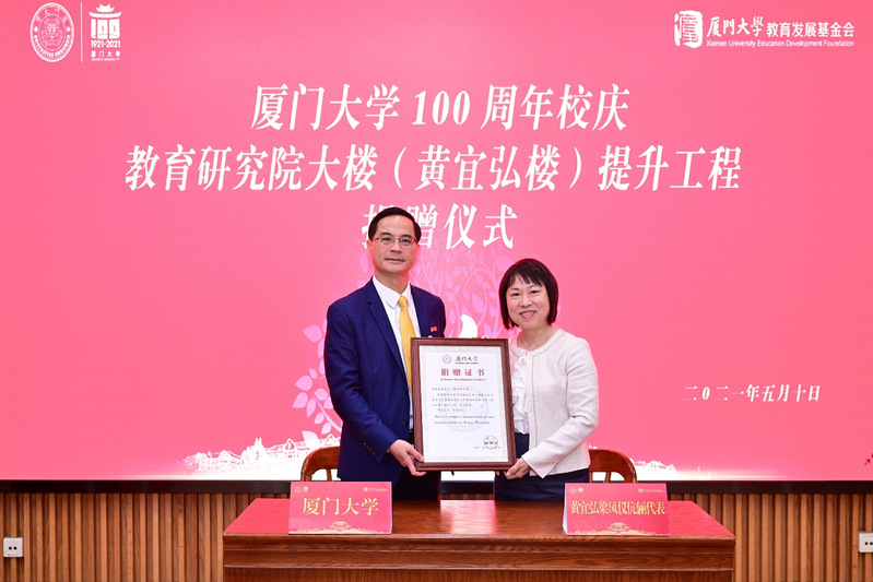 仪式上,邱伟杰副校长代表厦门大学与捐赠人代表招慧霞签订捐赠协议,并向黄宜弘博士、梁凤仪博士颁授捐赠证书。