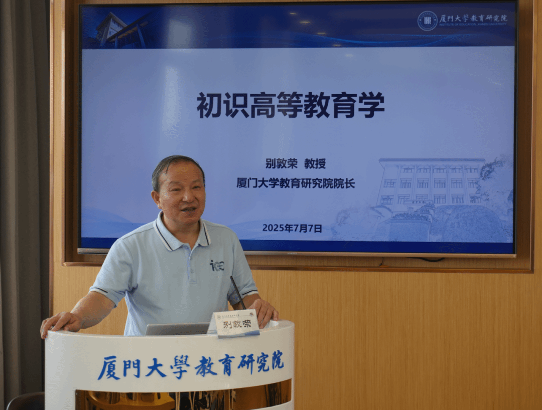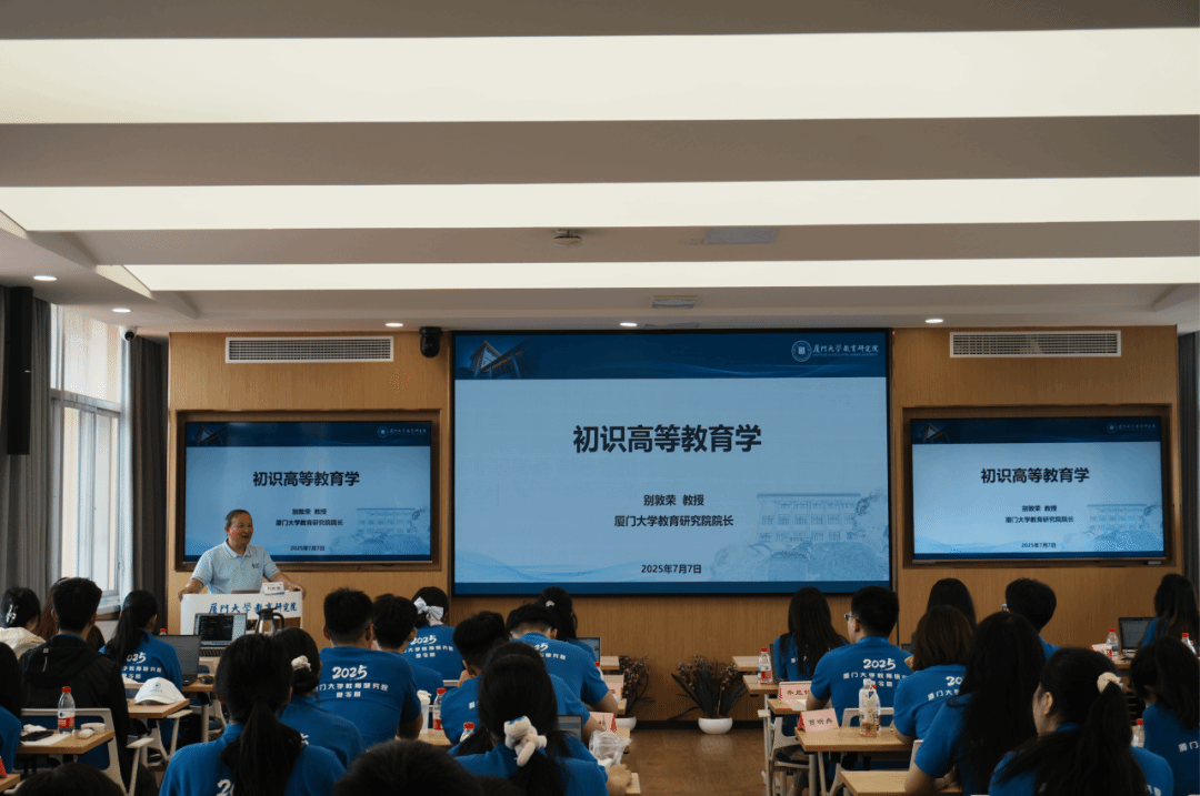 7月7日上午,院长别敦荣教授为全体夏令营营员作题为《初识高等教育》的学术讲座,帮助营员进一步了解高等教育学学科的发展历程、研究领域、学科特点与发展前景。他强调了潘懋元先生对高等教育学学科创建与发展的突出贡献,并指出厦门大学是高等教育学人才培养的阵地,希望各位同学可以借此机会与高等教育学结缘。接着,别敦荣院长从原理性研究与应用性研究两方面向营员们简要介绍了高等教育学研究领域,并结合学科特点,进一步点明高等教育学的独特魅力。他指出,作为一门年轻且极具发展潜力的学科,高等教育学具有实践性、应用性、跨学科性等多重属性,服务于国家高等教育高质量发展。最后,别敦荣院长分享了高等教育学的发展前景,表示其就业前景广阔、职业发展多元,鼓励营员们把握机遇,深入探索高等教育学,在这片充满无限可能的学术天地中开启属于自己的探索之旅。